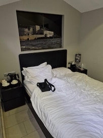 Room appeared to be clean, however, there was black mould on ceiling, also a small hole in ceiling that dripped water, just missing bed. Had no interaction with the staff, after check in. Don't know, didnt stay long enough to go shopping. Air conditioning unit was noisy, so had to turn off until it was to warm, so then turned back on to cool room. Room was sold as a Deluxe Queen room!! There was nothing Deluxe about to room!! Small with just enough room for bed with 2 side cabinets, wardrobe space!! Consisted of a 200mm deep frame on wall that had 3 hangers in!! No where to put case to open to retrieve clothes other than putting it on the bed. Loud live music from the bar, was very evident from the room, which went on until late. My room was on the 4th floor, but lift only goes to the 3rd floor!! And safety wise, there was only 2 rooms at this level in a dead end corridor only means of escape in an emergency was down to floor 3 to fire escapes? I booked this Hotel over 6 months ago, so expected to be given a decent room!! Not the room in the attic, very disappointed with hotel and Hotels.com. are these hotels vetted or inspected??