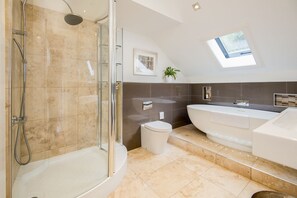 The first floor is accessed by two separate staircases which essentially creates two wings, perfect for two families or simply those wanting additional privacy from the rest of the group. The first staircase leads up to a king-size bedroom and a twin room, which share the use of a family bathroom. The main staircase leads up to the remaining five bedrooms, four king-size doubles and the double room complete with a quirky circular bed and freestanding copper bathtub! There is no danger of any ques to the loos, these rooms share the use of a family bathroom and two shower rooms.