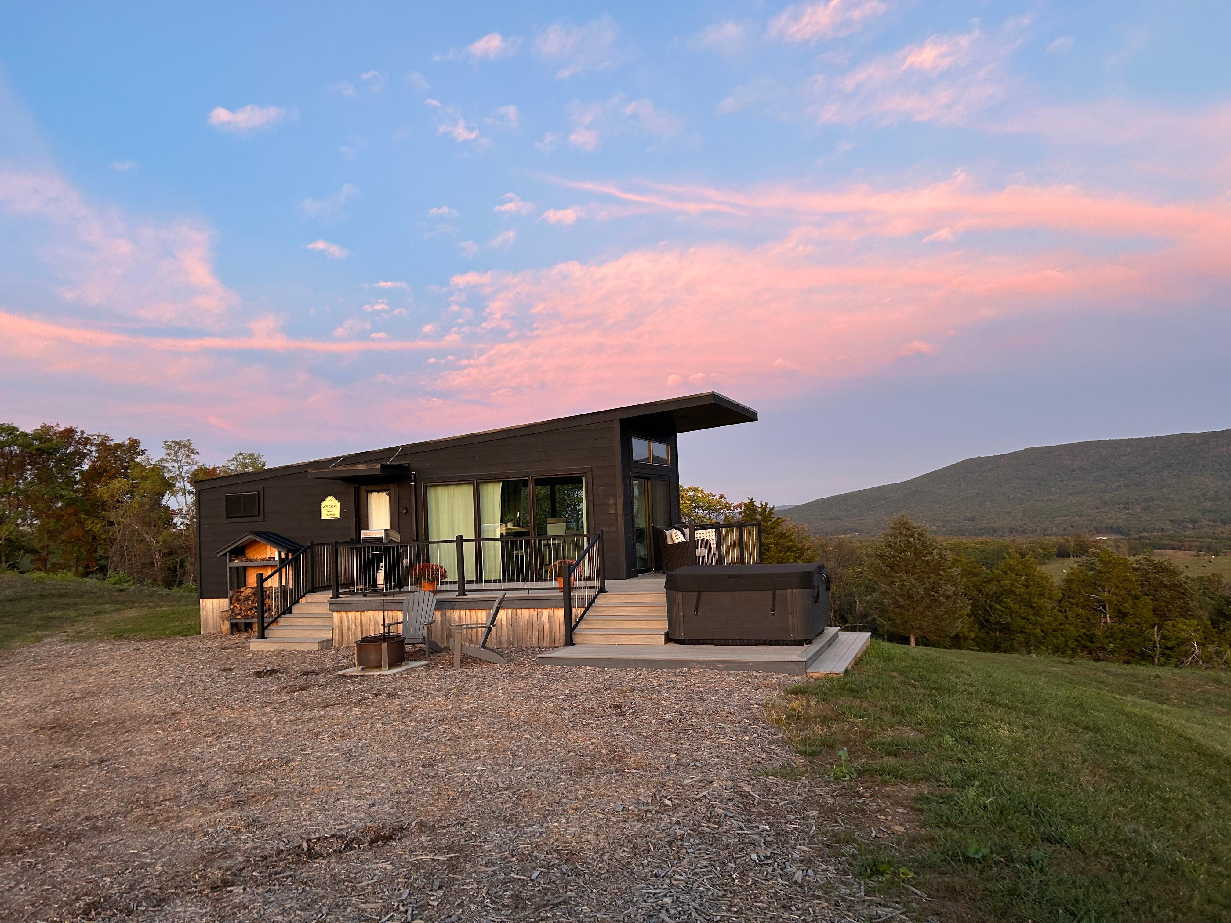 Built specifically with rejuvenation in mind, this modern retreat was created for couple getaways! Escape to the mountains - The outdoor space of our modern cabin is a serene haven designed for ultimate relaxation and connection with nature. Start your mornings with a steaming cup of coffee on the spacious deck, where you can soak in the breathtaking mountain views and the gentle morning light. Take a stroll to your private pond (you might see the owners or there children playing there as well) for a picnic in the afternoon! As the day winds down, fire up the charcoal grill for a delicious meal, then unwind in the hot tub, enveloped by the sounds of nature. In the evening, gather around the fire pit for a cozy night under the stars, or take a short stroll to the hilltop pavilion for a peaceful retreat with an elevated view of the surrounding landscape.