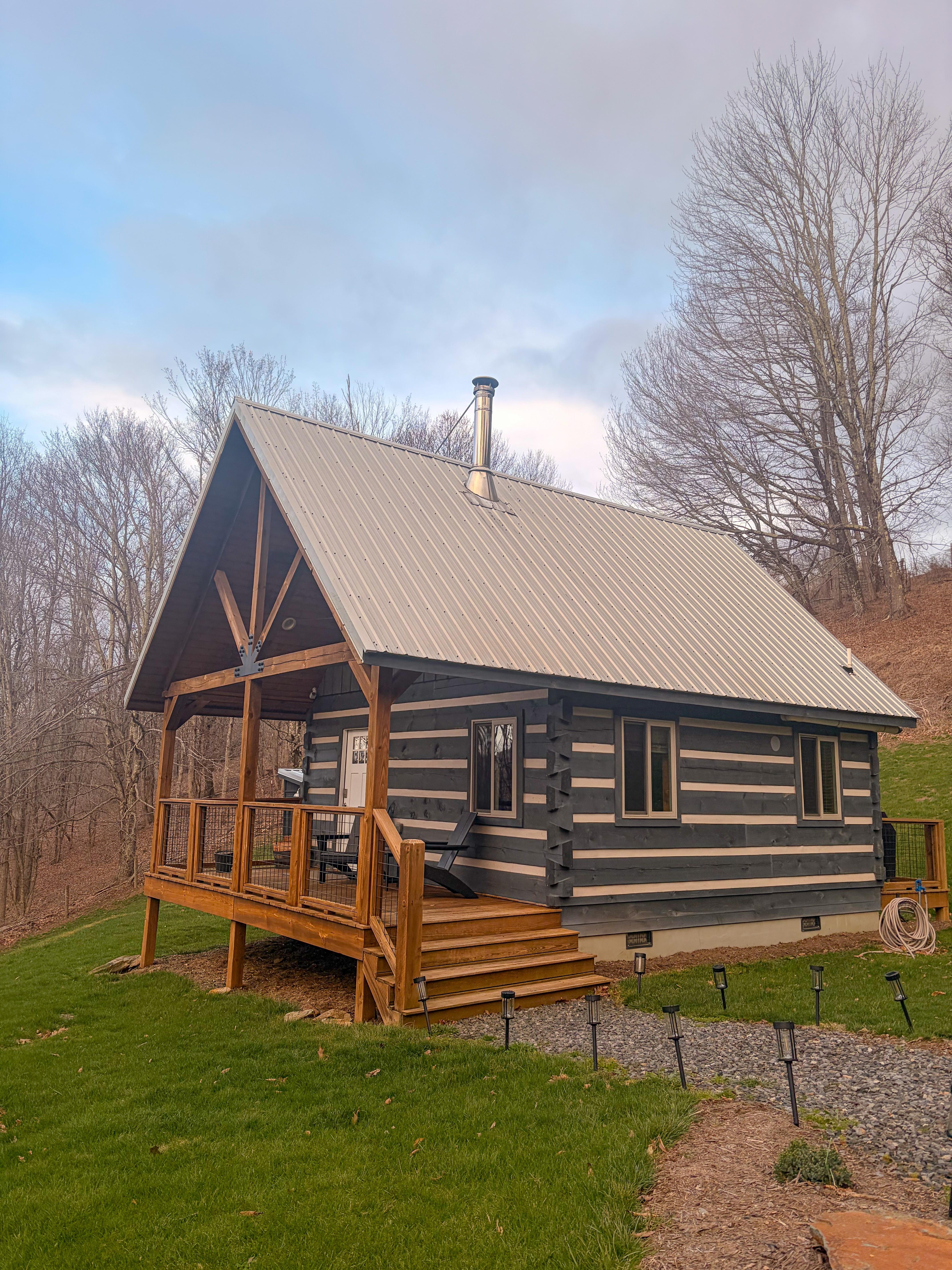 The cabin is a traditional full dovetail Appalachian cabin constructed of white pine. The cabin is around 600 ft.² with a full bathroom, full kitchen/dining area, loft bedroom area. The structure has a covered vaulted front porch and rear porch. There are many amenities to make the guest feel more at home Including towels, linens for the beds, soap/shampoo, cooking utensils, pots/pans and anything else you would need for cooking a good meal. We have a Weber kettle grill on the back porch for grilling out as well. In addition, we provide complementary coffee and a bundle of firewood for the outdoor pit.