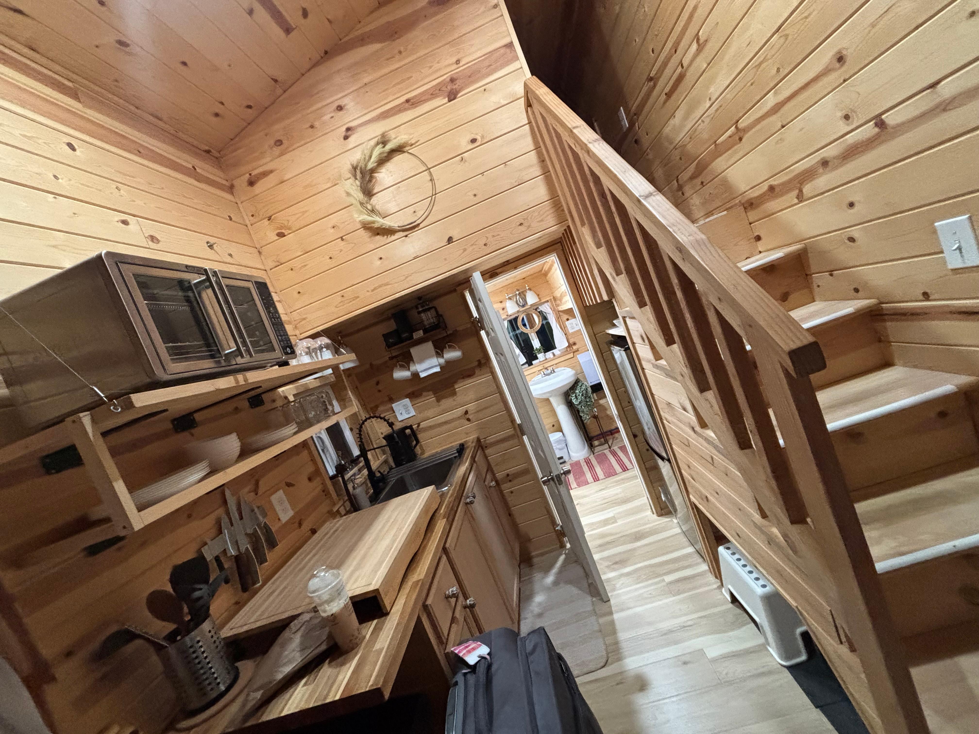 We have space for storage items within the tiny home loft for longer-term stays, but space is limited. An iron/ironing board is available with a 24-hour request time. The kitchen comes equipped with a medium-sized airfryer/toaster/oven unit.