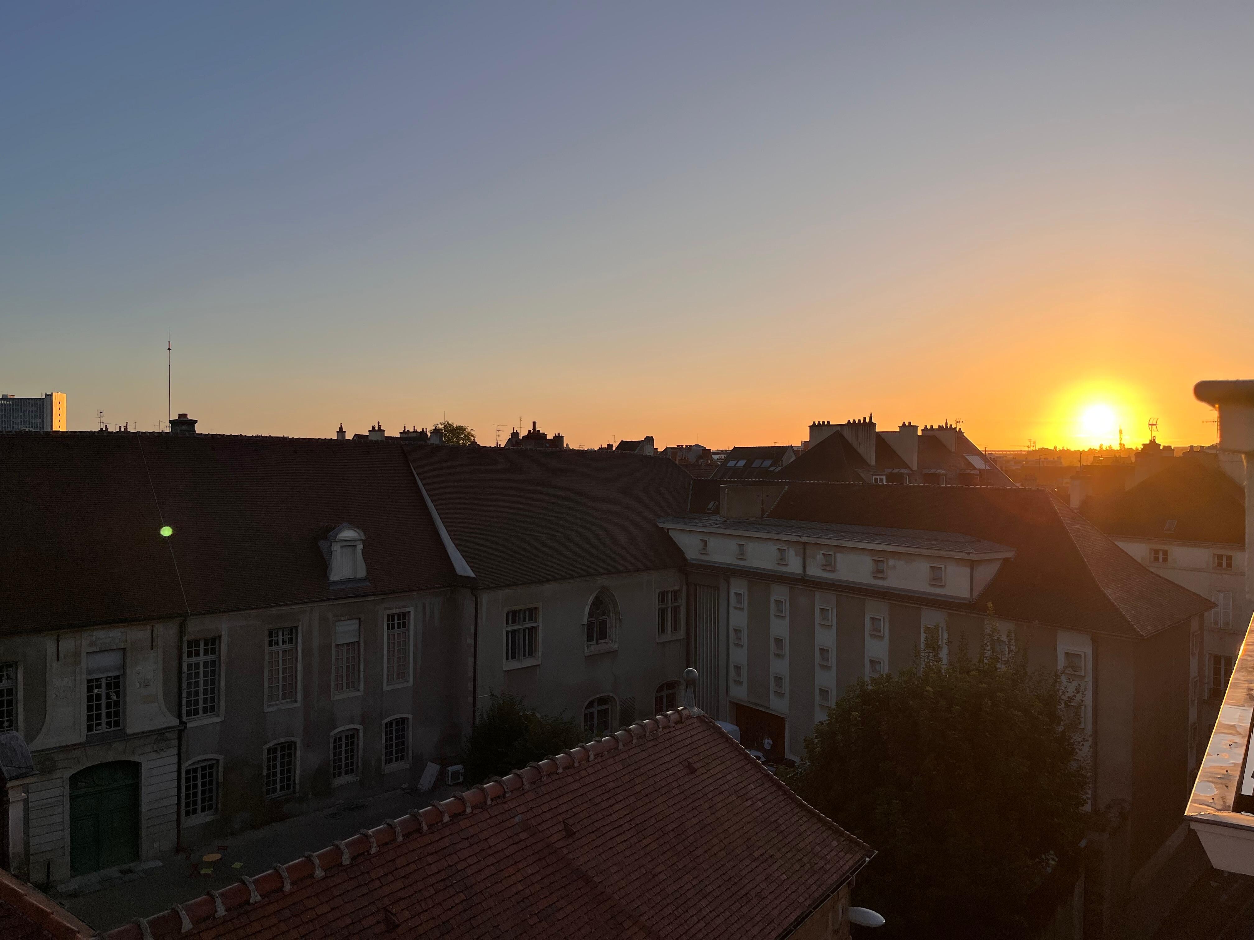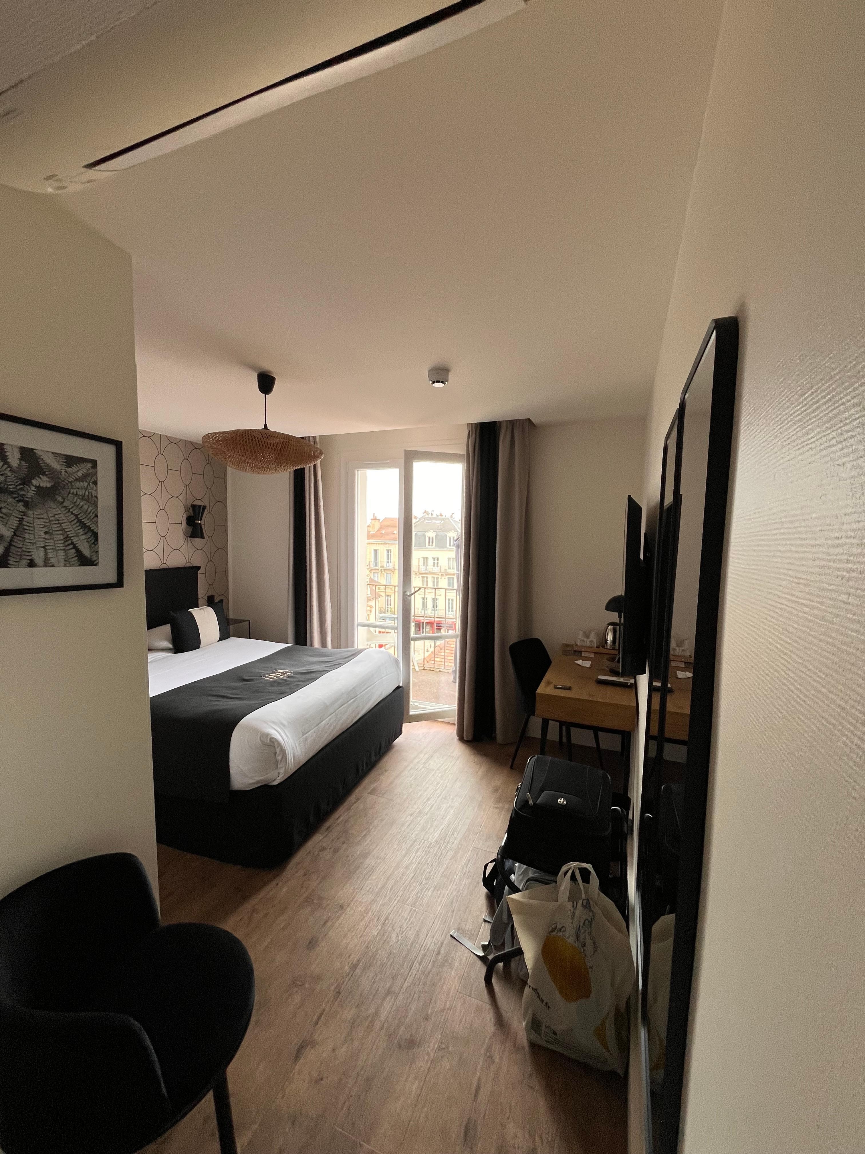 We were in one of the annex rooms, not the main property. Our room was on the fourth floor of the building without an elevator, and the stairway up is incredibly narrow and spiraling. It does tell you this on the reservation, but for American travelers just be aware of two things; first when they say it’s on the third floor we would consider it the fourth; secondly, the spiral staircase is small, narrow, and very steep. Not likely legal here in the states:) That said, the room was absolutely amazing! It was beautifully appointed with a comfortable bed, internet, huge windows on one side that let in plenty of air (but no view except of the building across the way on the east side), and it was super clean. The location is perfect for a trip to Dijon. Everything you want to see is an easy walk. There are more restaurants in walking distance than any city I’ve ever visited! If you’re OK with the stairs, I can’t recommend this room enough, just a perfect spot for our three day trip to Dijon.
