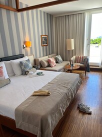 Staff were excellent, extremely kind and helpful. All staff went above and beyond to make our staff exceptional! The entrance to the hotel is outstanding with an incredible view of the sea the minute you walk in. We were greeted extremely well upon our arrival - extreme apologies I’m not sure of the lady’s name. She showed us to our V level room, which was readily prepared with complimentary gifts to celebrate our wedding anniversary and big birthday. She showed us how we select a scent of our choice from our room and we were greeted with a wonderful sea view. This wasn’t an interrupted sea view as there were lots of trees and a view of a car park but the sea view was wonderful all the same.