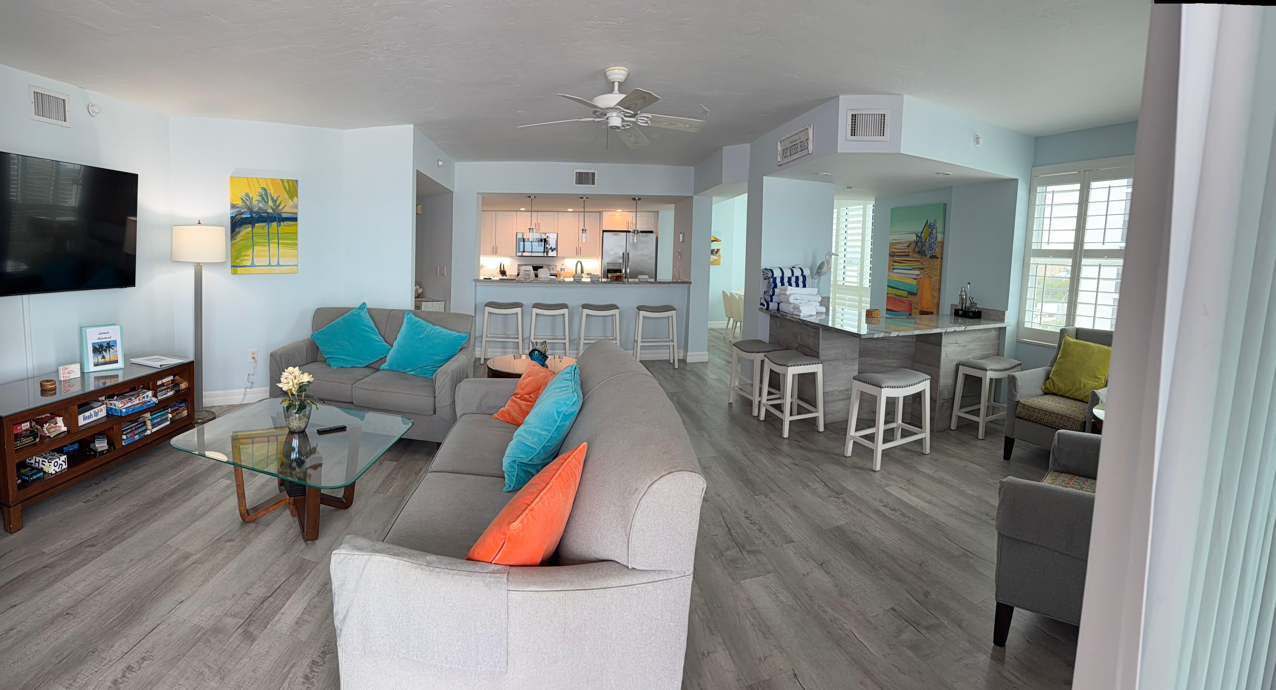Owners have taken extra steps to try to ensure that you have the best experience possible! This condo has well-stocked cabinets if you intend to cook, with plenty of cooking tools as well as a Keurig, an extra wide toaster, and even a wine cabinet!