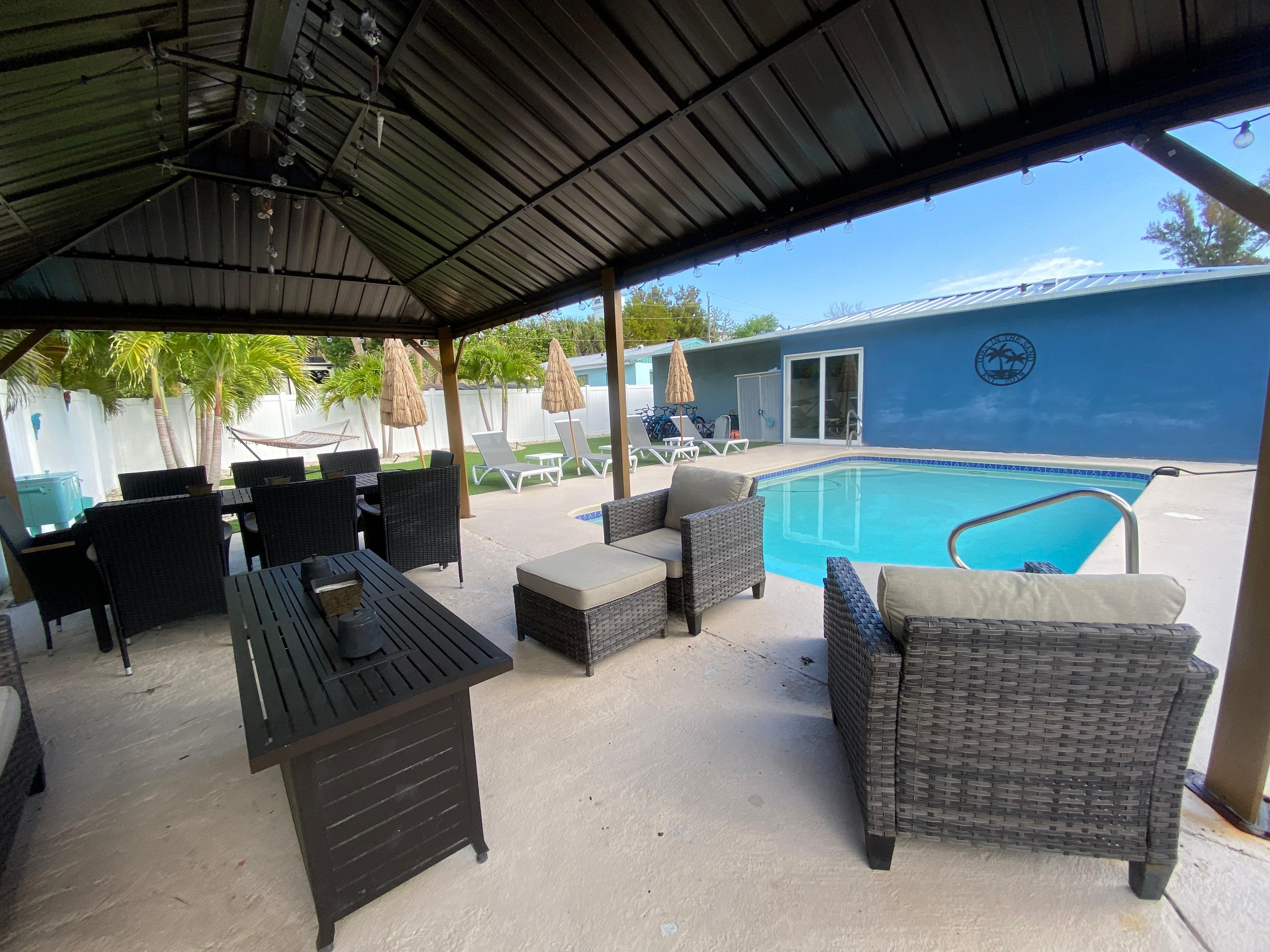 Outside, you'll find our own private oasis- a sparkling heated, salt water swimming pool and gazebo that includes lighting, a propane fire-pit table and plenty of seating. You can soak up the Florida sunshine in privacy on the loungers. Feel free to fire up the grill and barbecue or simply enjoy a refreshing dip to beat the heat.