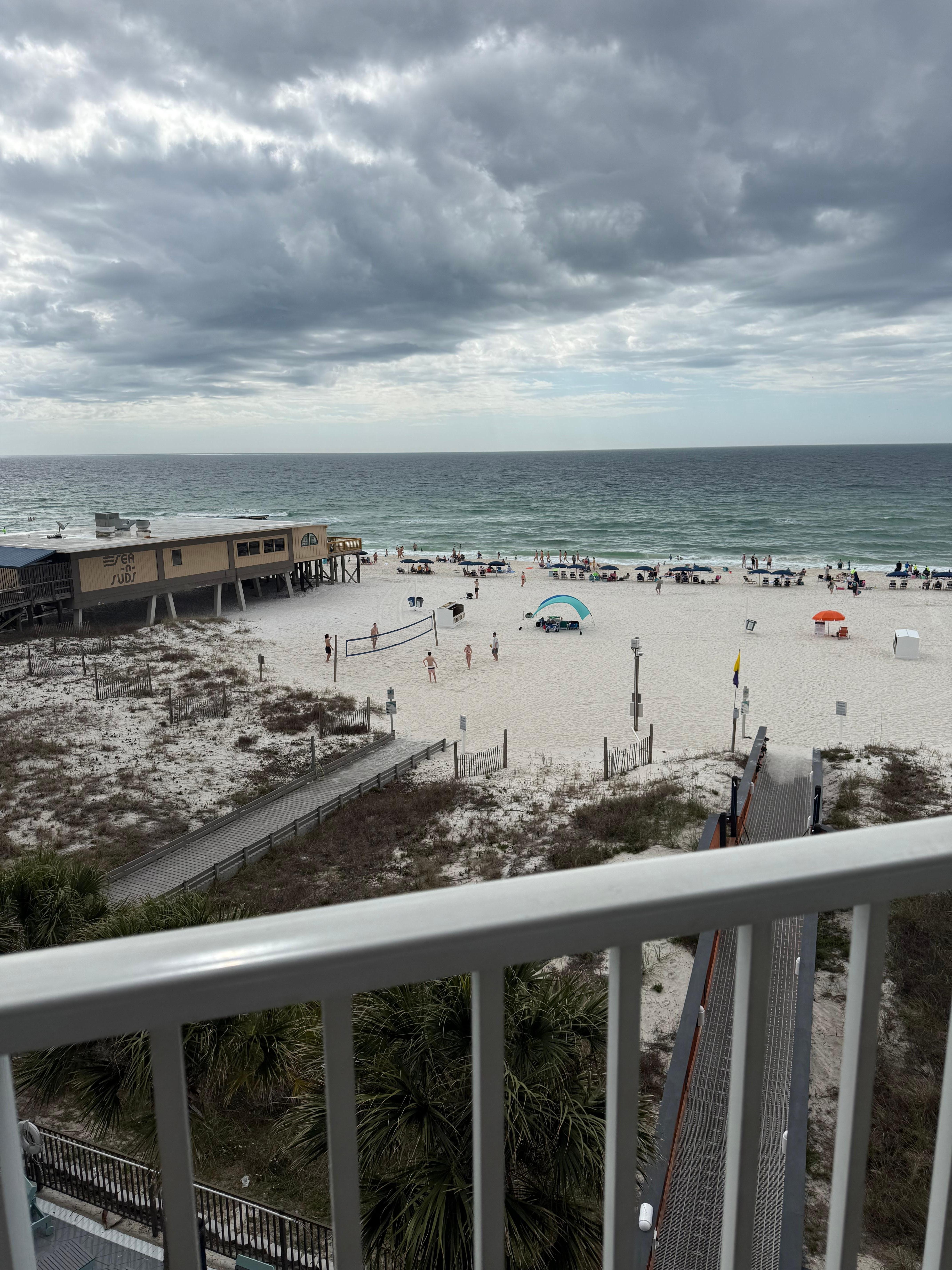 This condo is in a great location. Once you park, just about anything you need is within walking distance which is a great when you have teens that you don’t want driving on unfamiliar roads. Water play area for small kids is just below the balcony, but is not noisy or bothersome for those without small kids. Unit being on the 4th floor makes it easy to avoid the elevators during peak times. Although on a lower floor, it still has a great view of beach. Rain showers are easy to escape by walking over to shelter under Sea N Suds just next door. Very pleased with the location.