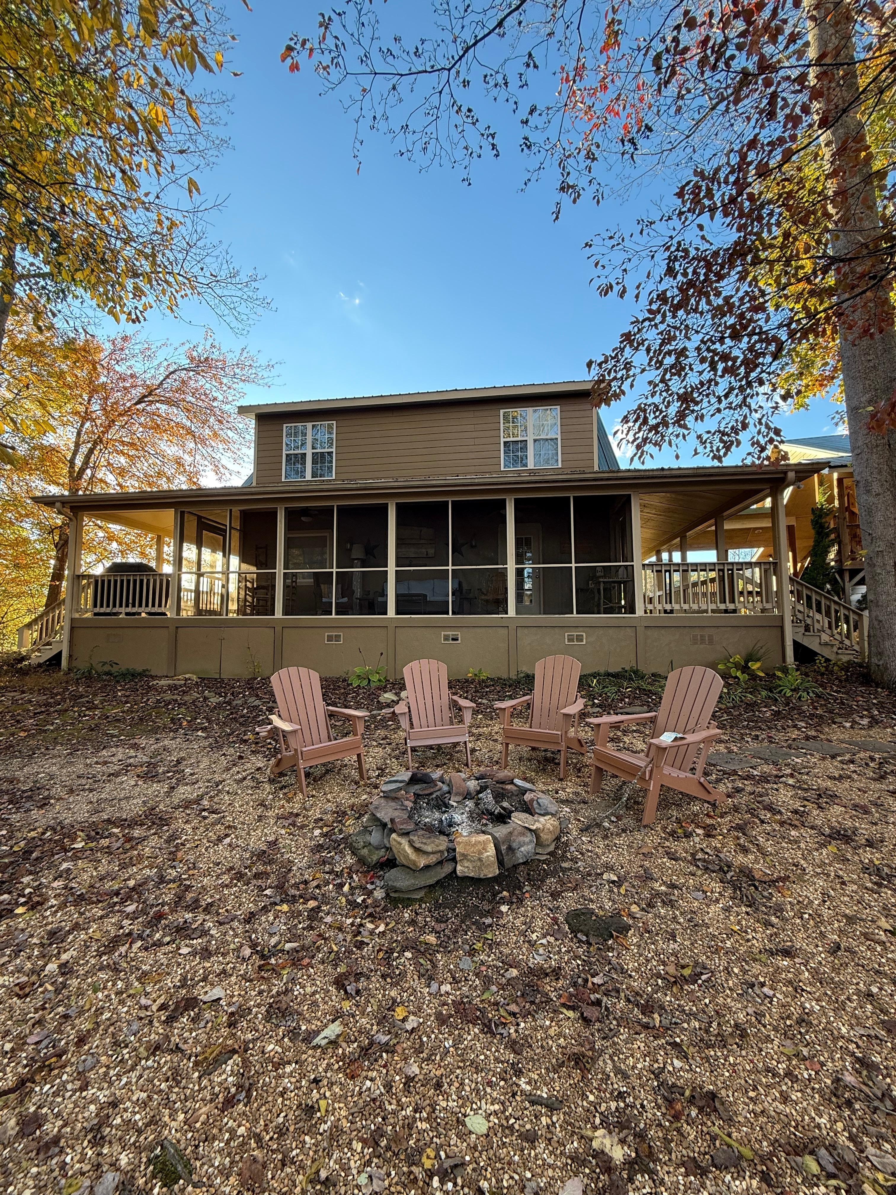 Other amenities on property include wifi, flat-screen TV with cable, outdoor grill, AC and Heat, outdoor fireplace with wood provided, indoor fireplace with gas logs, hairdryer, basic soaps, and linens and towels provided.