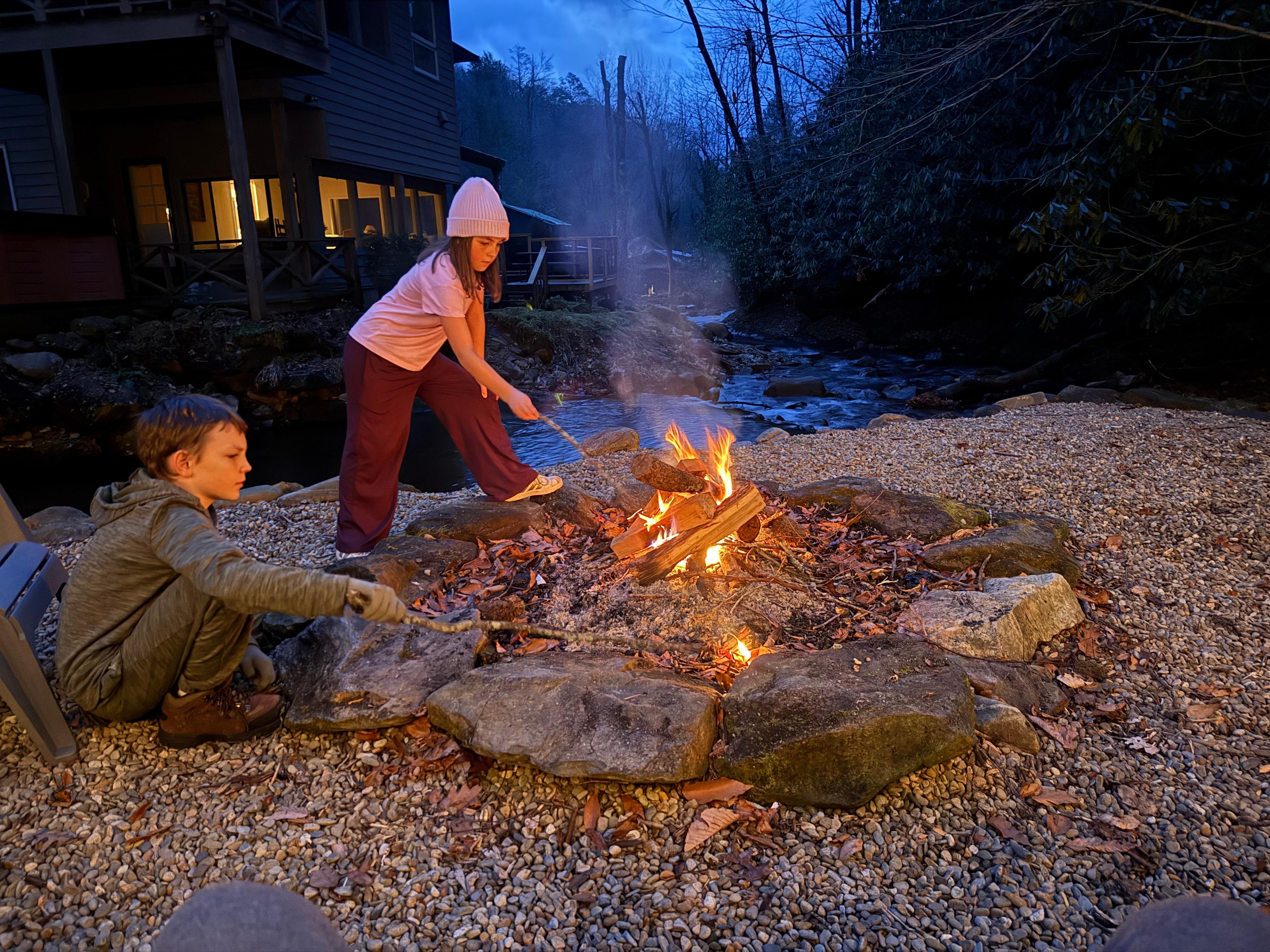 We loved the creek behind the house. There were so many beautiful flowers. (Watch out for bees!) The kids were able to catch salamanders and crawdads. The firepit by the creek is in a perfect location. The smoke even seems to naturally blow away from the hillside, so you can sit by the fire without smoke going in your face. The kitchen provided metal wire marshmallow roasting sticks (very helpful). The hot tub was clean and in great condition. There is a great waterfall hike up the road. Pulling out of the driveway on a blind curve is a bit scary. It's a good idea to pull out forward. The view from the master bedroom is stunning. You can sit on any of the decks to drink coffee during the crisp, cool mornings.