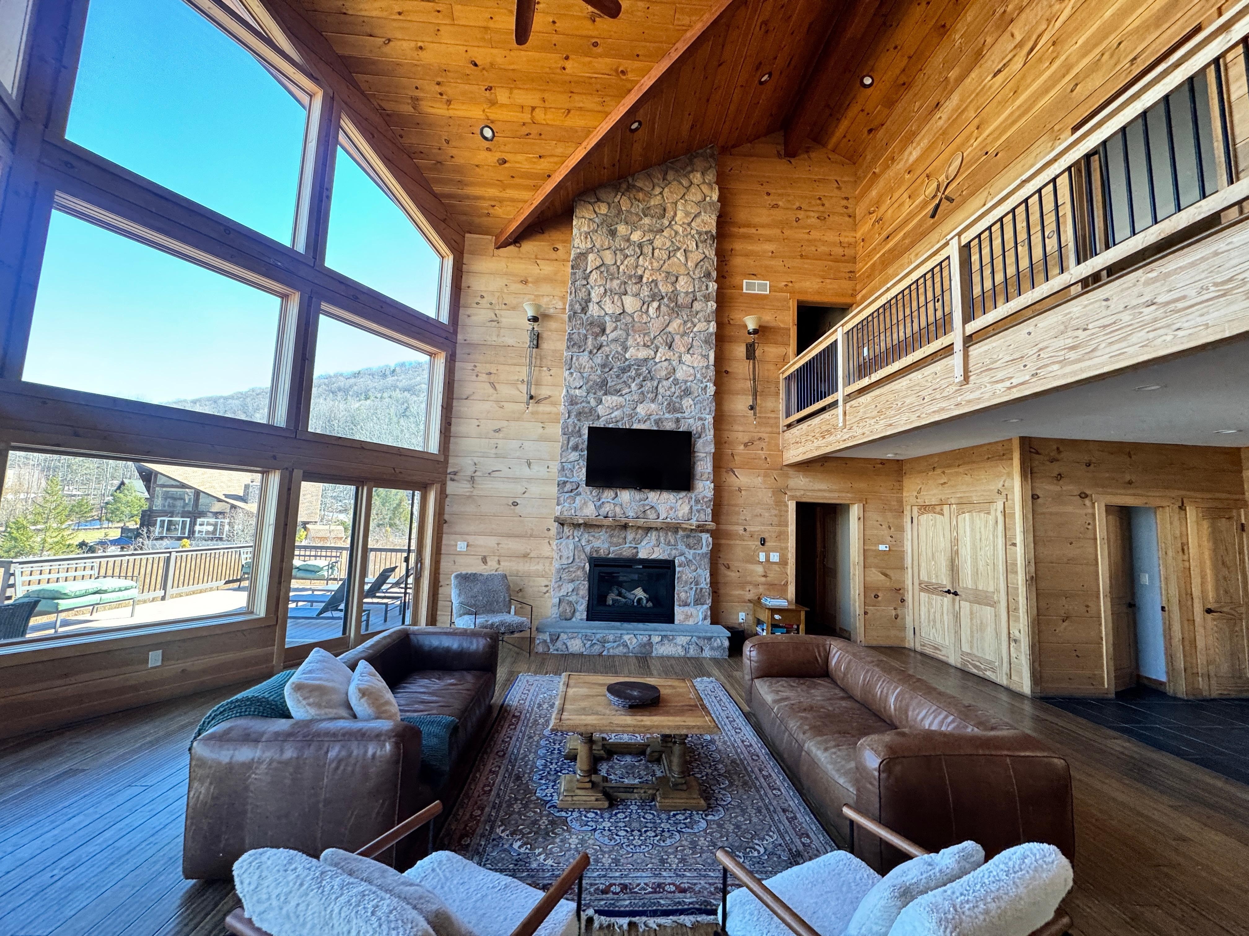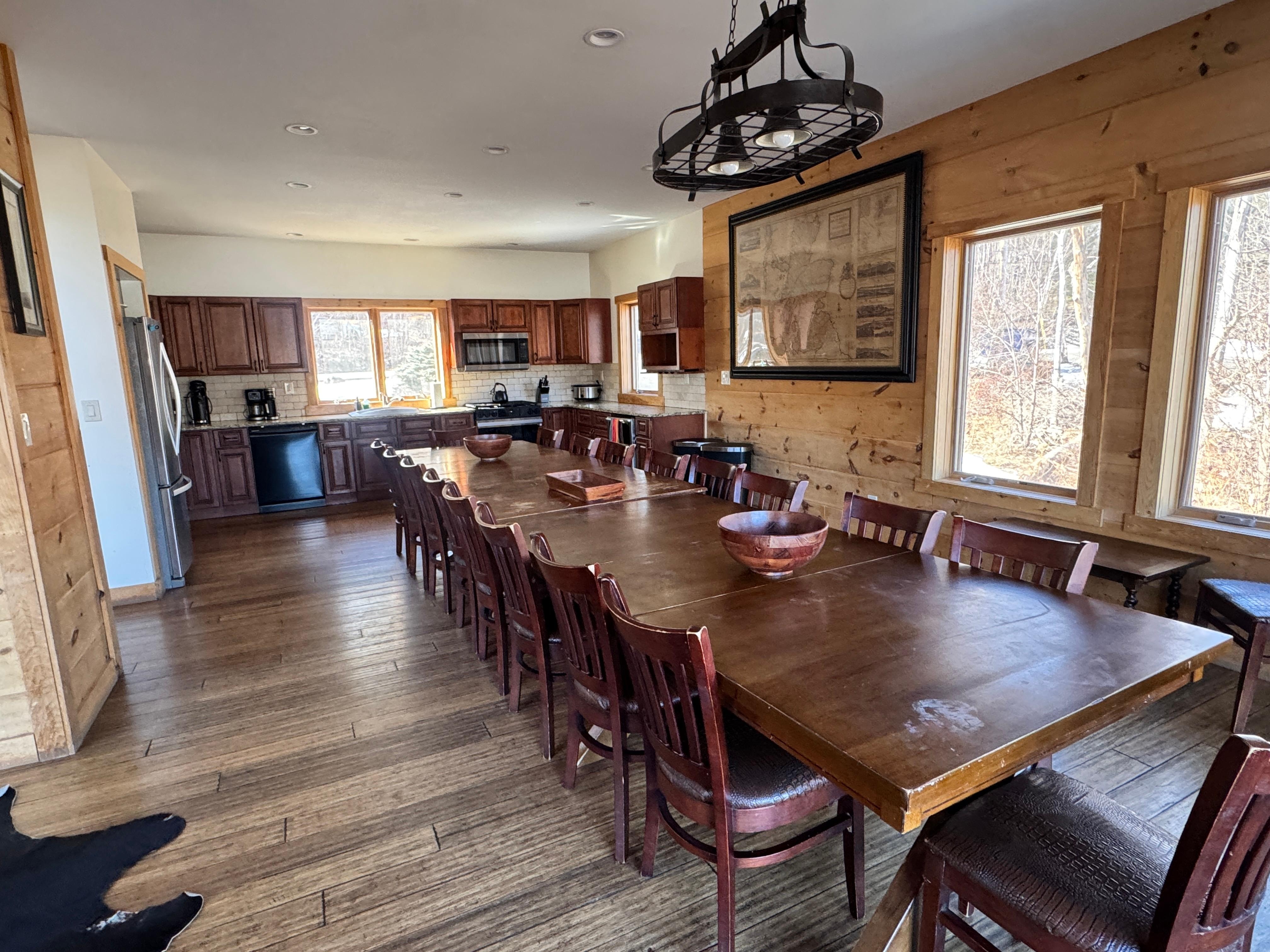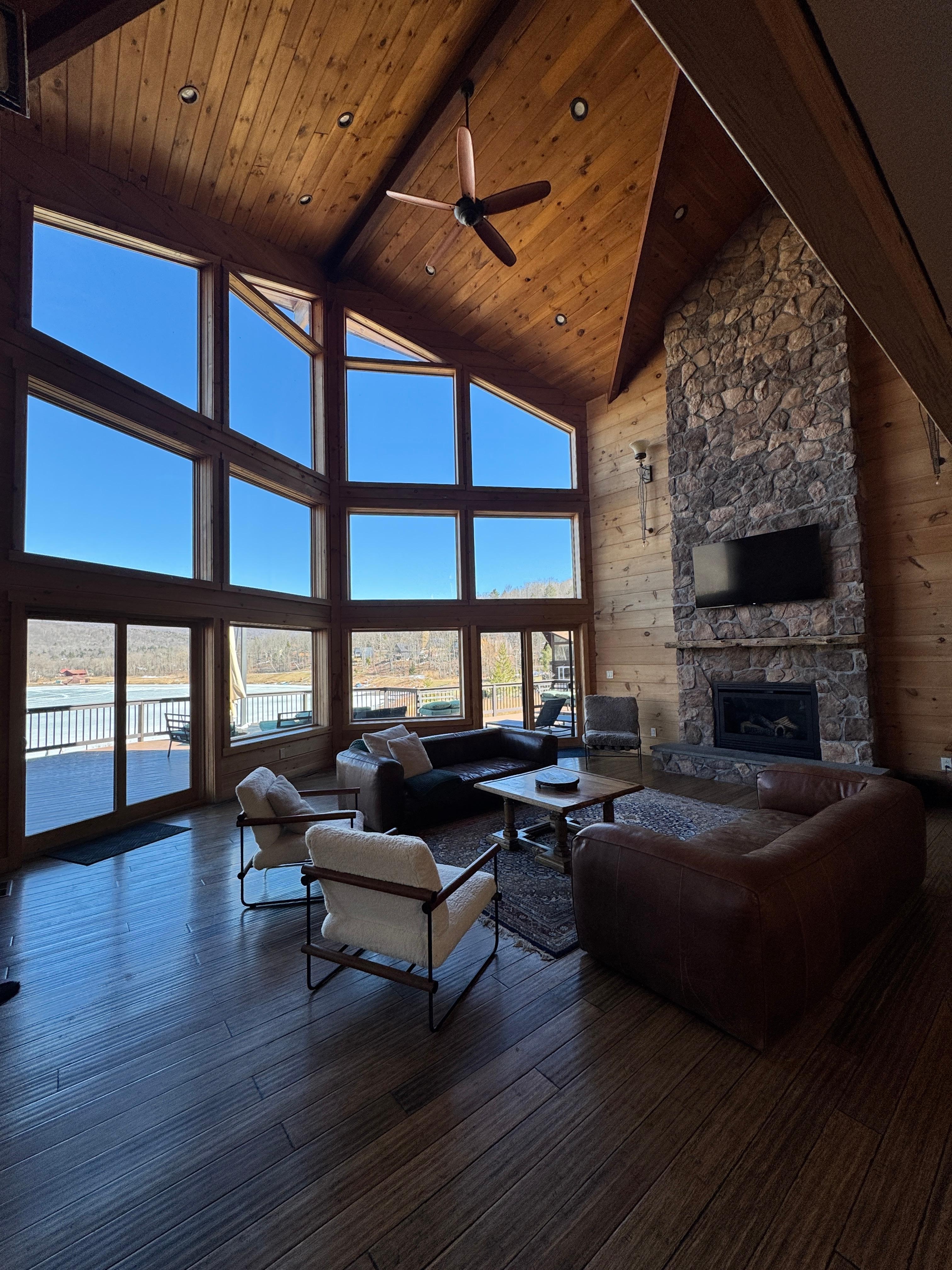 Our large family group of 23 (ages 2 to 71) had a wonderful time at the Hunter Chalet. The area is beautiful with lots to do for all ages. We found a lovely swimming hole in a nearby river, took lots of walks, went to several great restaurants for lunch. Our family loves to cook dinner together and enjoyed using the large and well stocked kitchen. The huge deck was full of comfortable furniture to encourage hanging together outside. The fire pit was used to make s’mores. The owner was quick to respond to any need/question we had. There are two huge washers and dryers which made it easy for us to keep up with laundry. The many bathrooms made for no waiting to shower. The lake was fun to canoe and kayak in, but not so great for swimming due to so many plants growing in the lake. We liked that there were not televisions in the bedrooms, which kept the family engaged together. In fact, we rarely used the large wall tv in the great room! The games in the basement kept people occupied on the rainy day and in the evenings. We can’t say enough about the beauty of nature in the area. Note that there is only one refrigerator (plus a small wine frig) and no working ice maker, so there may be several trips to stores for added supplies and bags of ice if you like to cook and like icy cold drinks. Other than that, we loved the space in this home and would definitely return there.