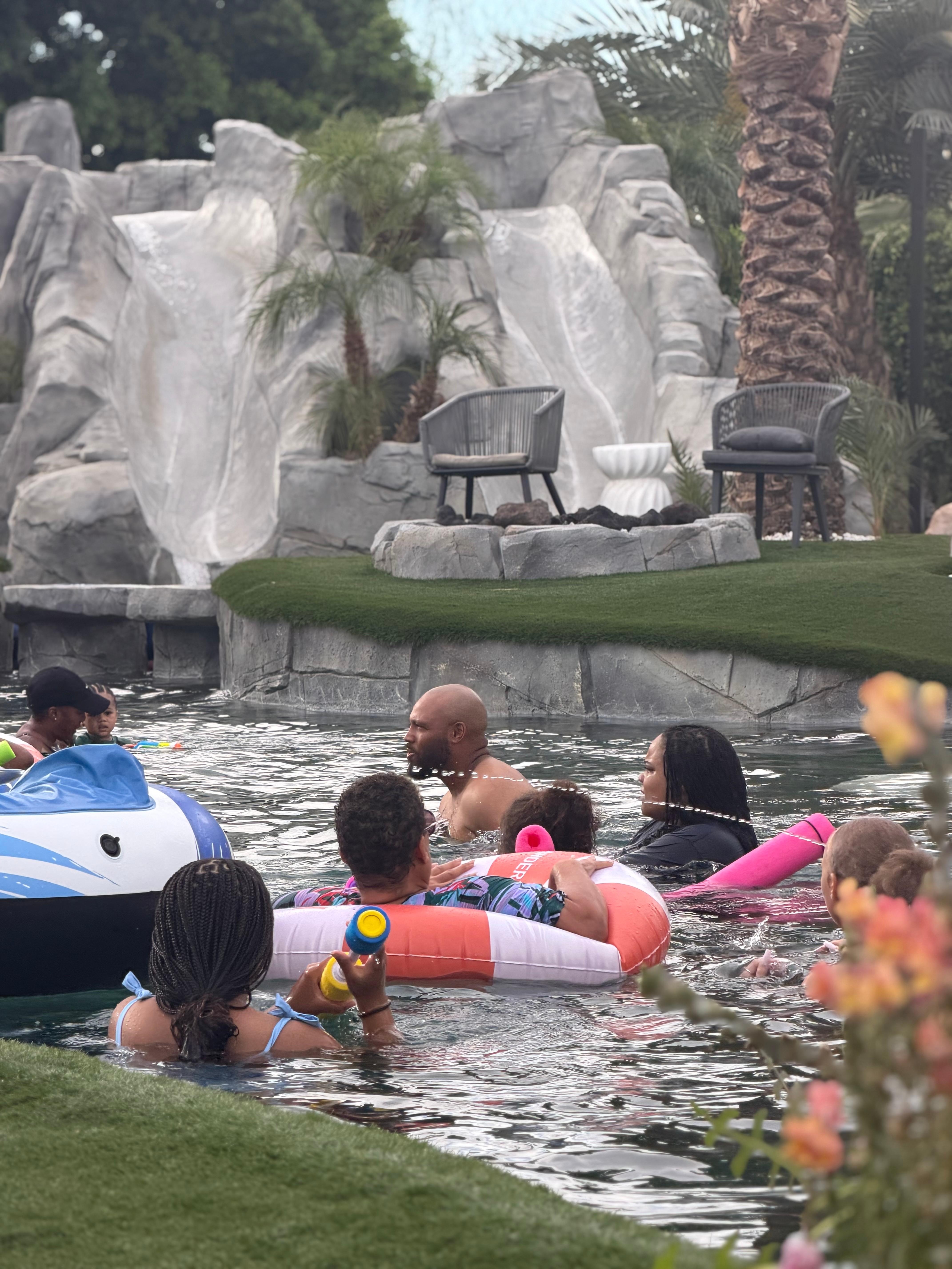 Lazy River Resort is a 6000' private, gated Lazy River estate in the heart of Indio California across the street from the world famous Coachella Festival Float down the largest private lazy river in the desert, relax in the main pool at the lazy river entrance, or lounge on one of the two islands with built in SPA.
