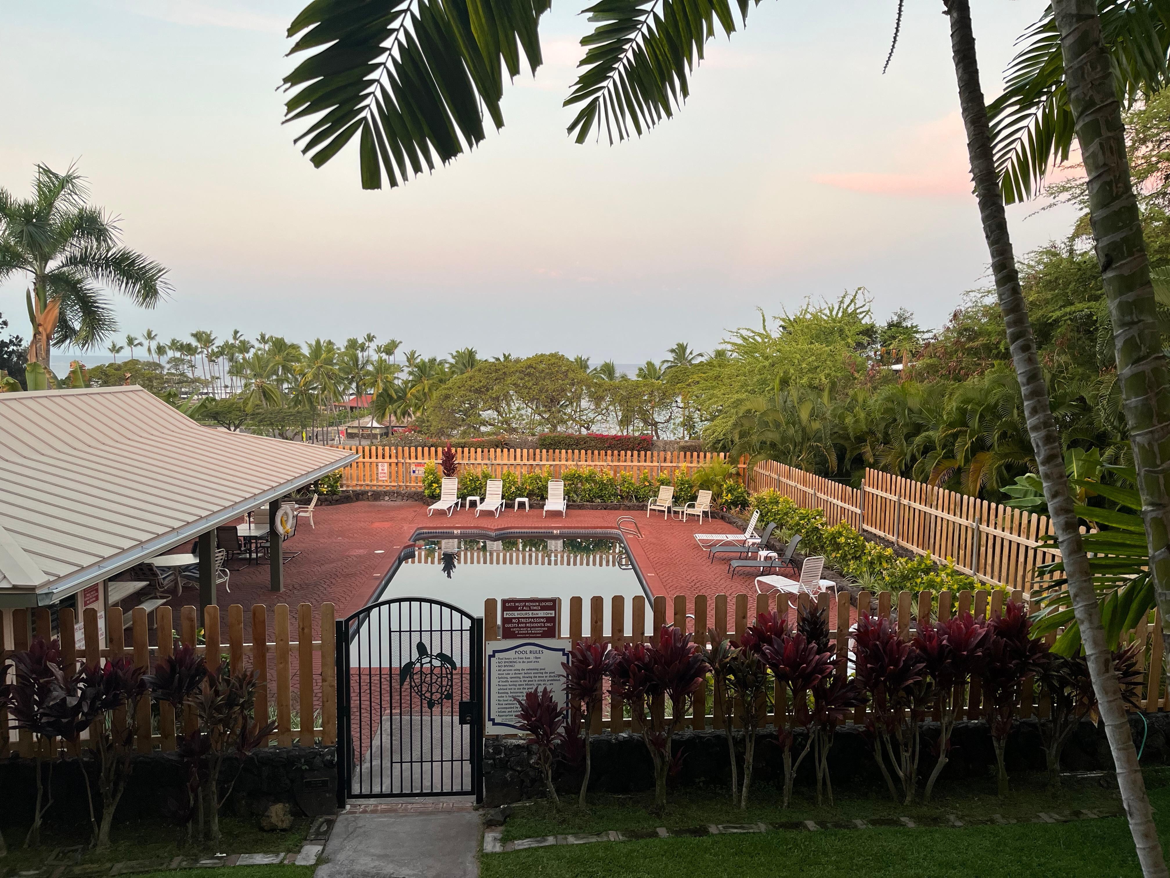 2 couples renting this unit. The space exceeded our expectations. The pictures did not justify how large the unit actually was. Very clean and the surrounding grounds and pool were spotless. Loved the covered parking-added bonus. Especially in the heat. This is a smaller complex, having only 15 units which made for a very relaxing quiet location. And just being set slightly back off Ali’i drive made for no real traffic noise. We often had the pool to ourselves as well. The kitchen appears to have fairly new appliances and was well appointed with a good selection of cookware and in great condition. The location was perfect. A 5 min(at most) from Kahalu’u beach park. The most amazing snorkel beach. It was so awesome to have some close access and unsure how many times we went there. The KTA grocery store and a Longs drugstore also very close ,5 min drive. Needed to reach out to management group on 2 minor questions and received very prompt responses. Would highly recommend staying here