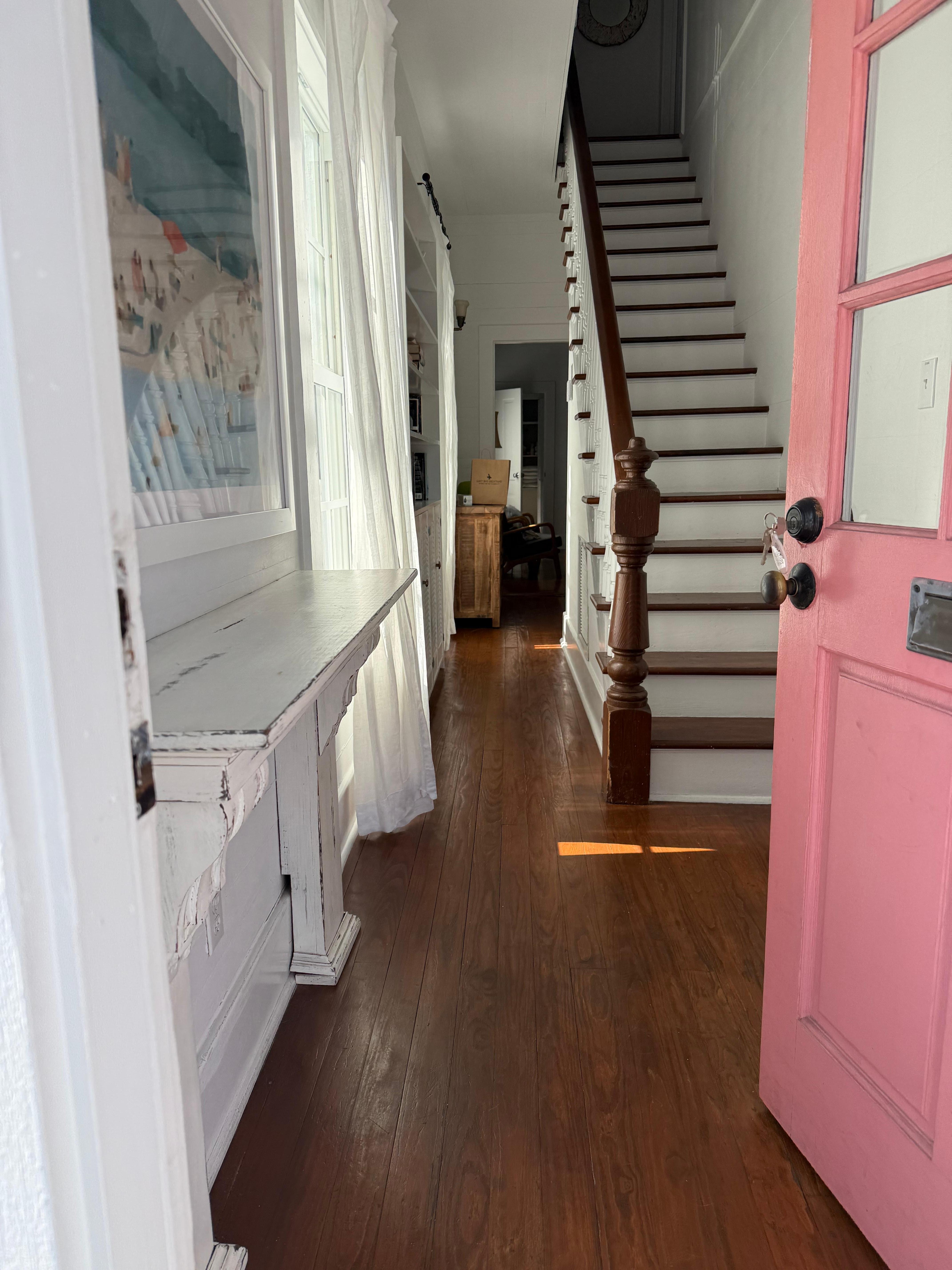Step off your private porch into your peaceful escape boasting rich, hardwood flooring, inviting you inside. A homey living room featuring beautiful wooden beams is outfitted with cozy furnishings around a flat screen TV for your movie or game nights together. A cheerful and fully equipped kitchen lies steps away to whip up your home cooked meals at the casual indoor bistro table for 2 or out with the whole gang on the covered porch dining table for 6.