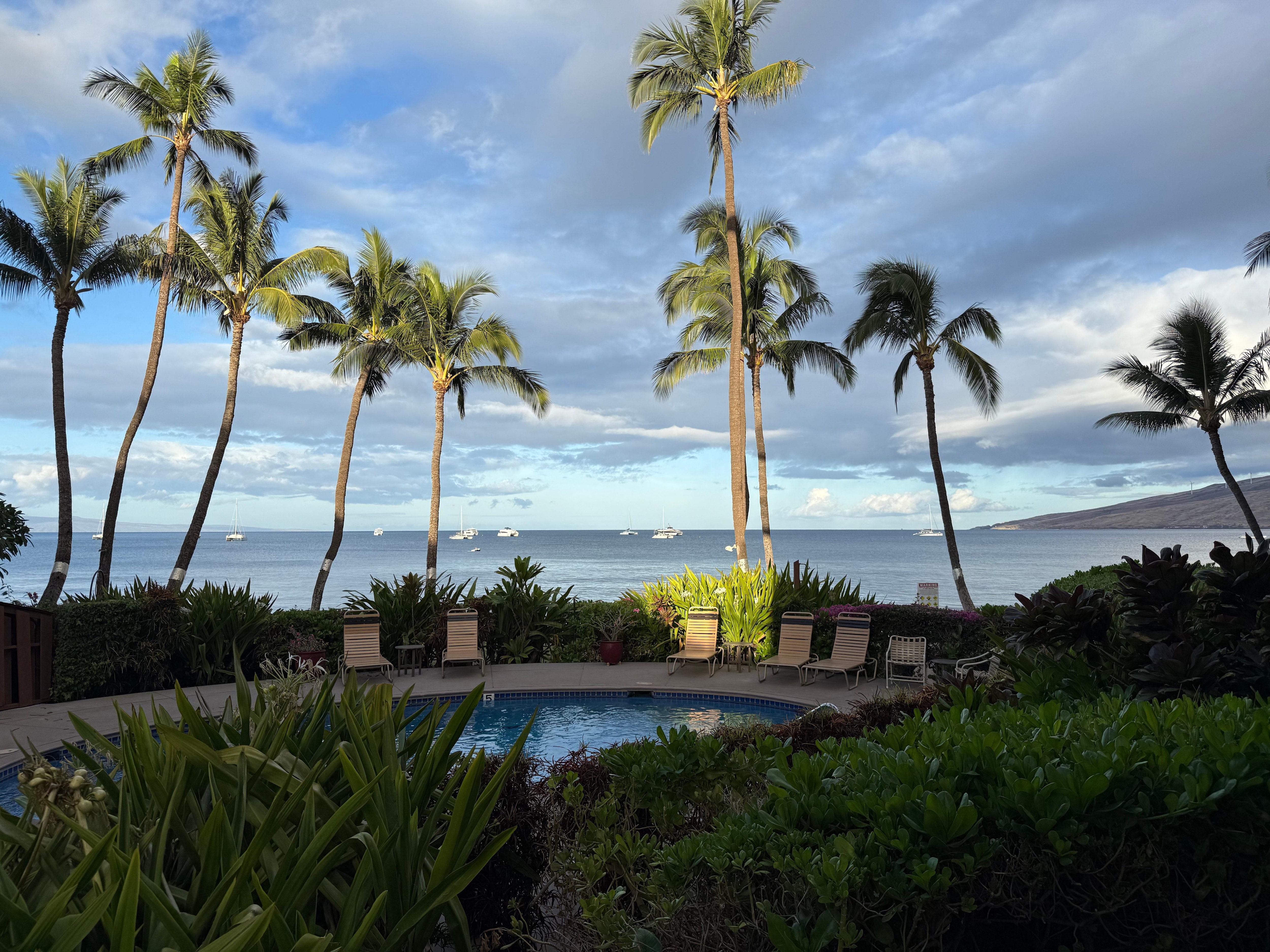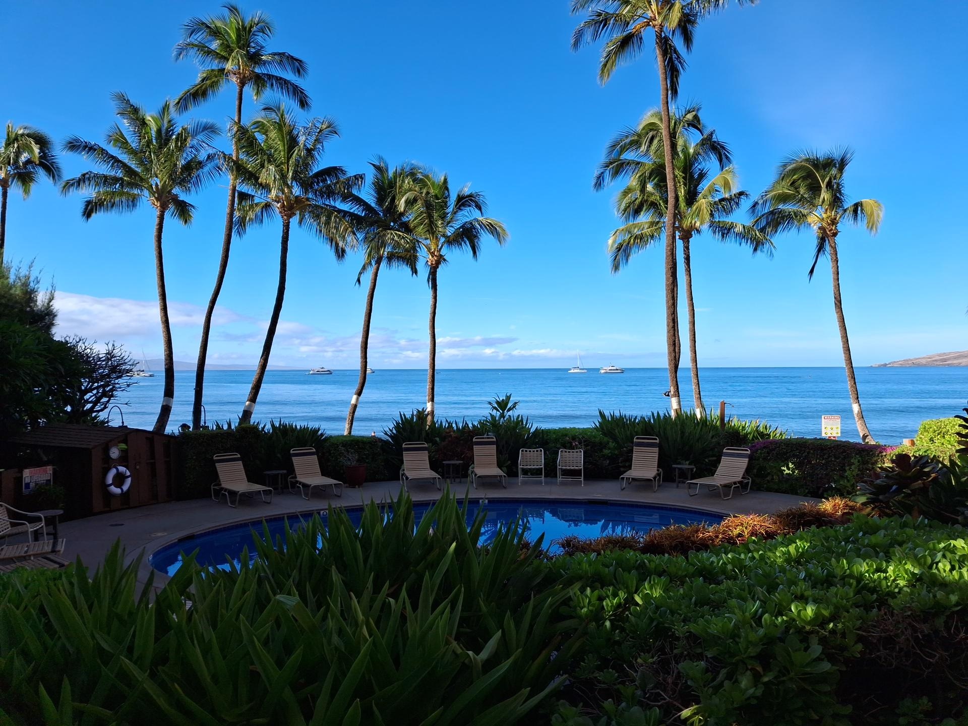 I loved much about this property. It was beautiful and clean although I did have to clean off the lanai table when I first came. Hard to keep up with the sand, but I just got there after check in time. I let the management know that it was time to clean the picture window facing the ocean. When you have such a wonderful view its really nice to have a clear view. The only problem I had was the noise outside my place when people were using the pool and the bush trimming early on my first morning which prevented me from meditating and later having coffee outside. I didn’t know this was going to happen (maybe a caveat would be helpful) or if it would be repeated. I would come back but rent a unit not directly next to the pool.