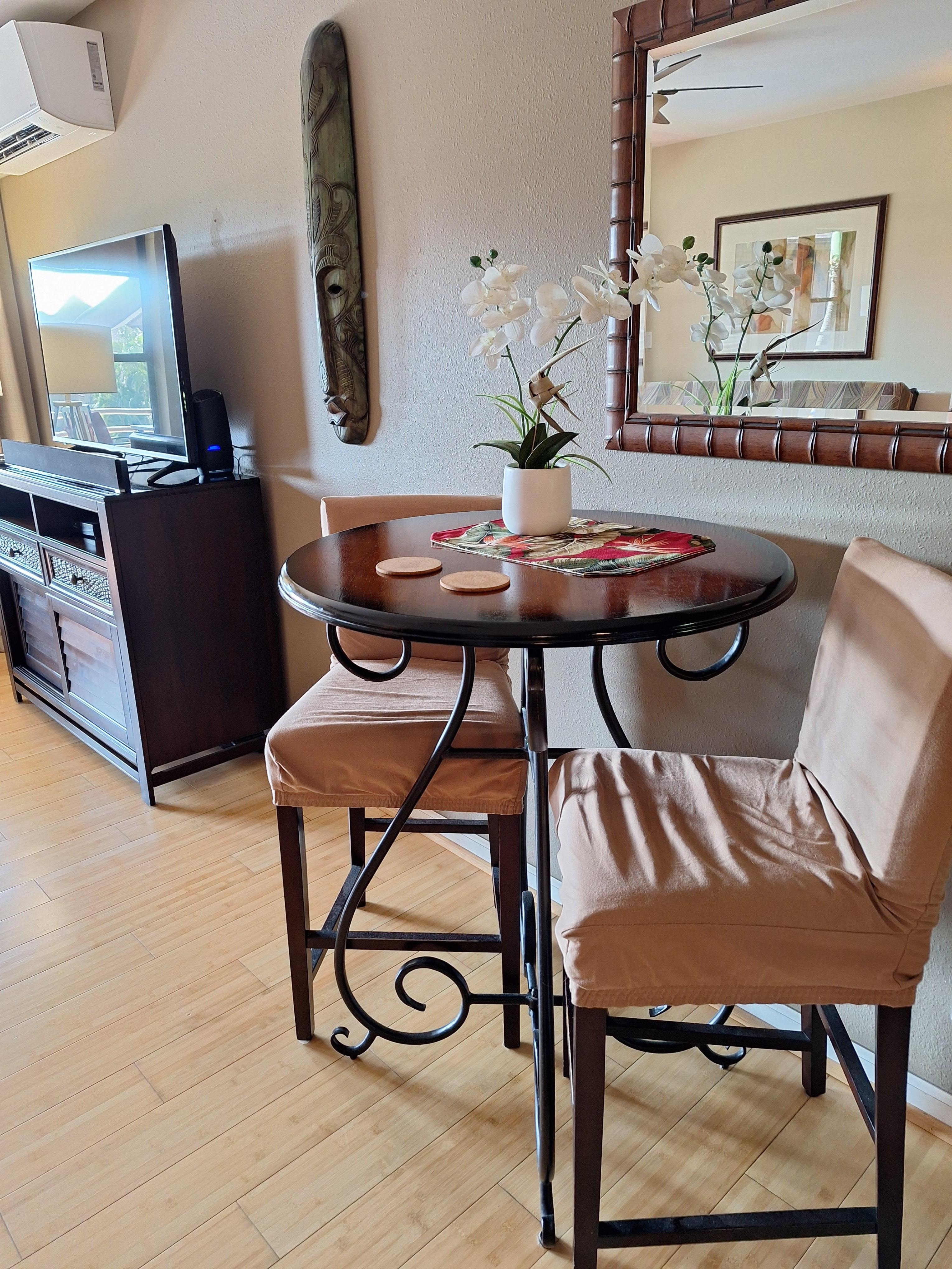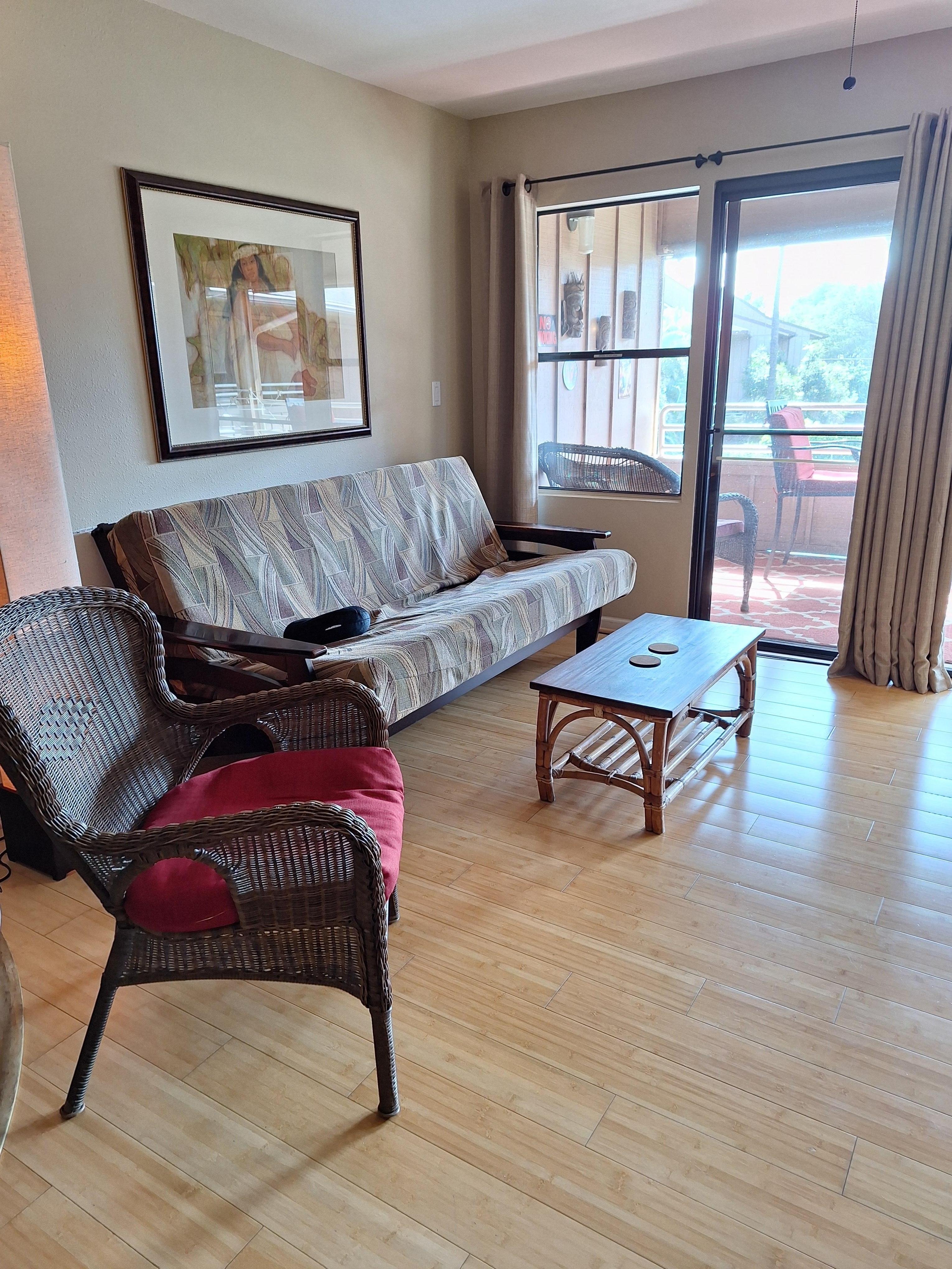 Bamboo flooring in living and bedroom, stainless steel appliances, queen-sized bed and full-sized futon with 7.5" memory foam make for at-home feel. The lanai overlooks the manicured gardens and crystalline pool, a perfect spot for morning coffee or afternoon refreshments. The complex is well lit giving you a safe arrival. A keyless entry system with rotating code ensures a secure contactless entry at any hour.