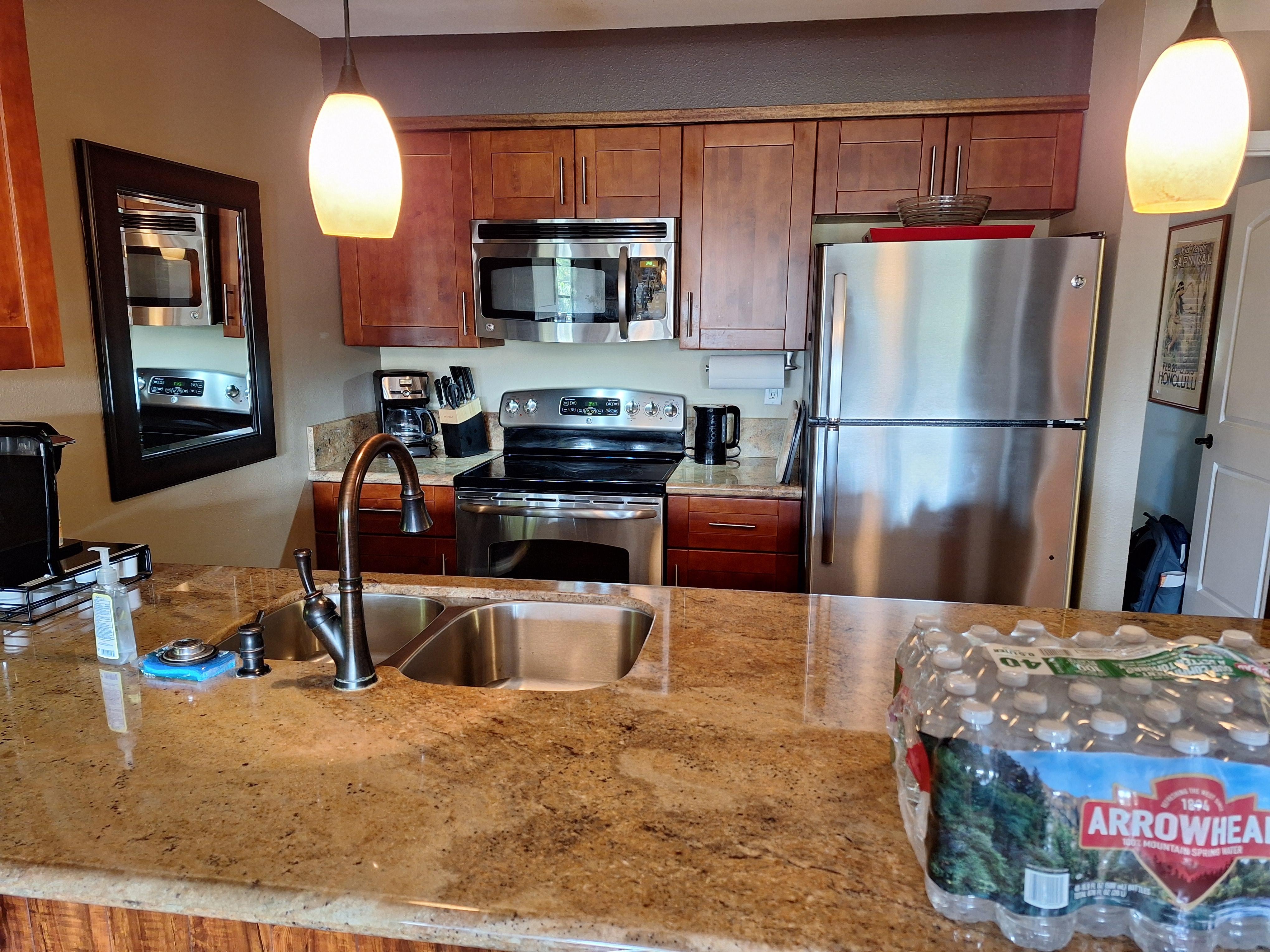 * Full-sized stainless steel range/oven, microwave, dishwasher.