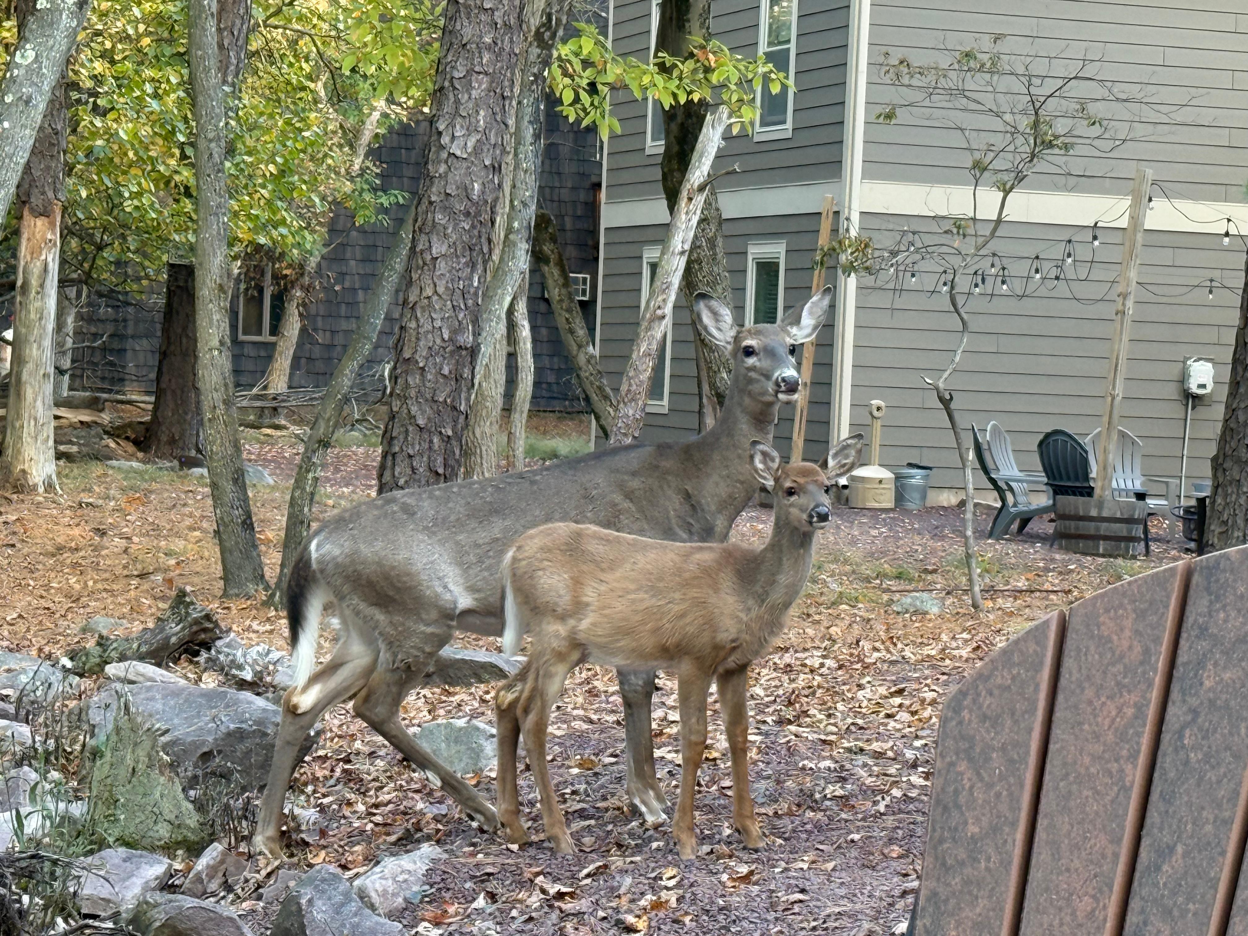 Kitchen was extremely well equipped — 2 of everything. Perfect space for our party of 14 to enjoy without being crowded. Loved the area and enjoyed the fire pit — it was our entertainment along with the deer and turkeys. My husband saw a bear in the very early hours who tossed all the trash cans on the street. Great area and lots of fun!