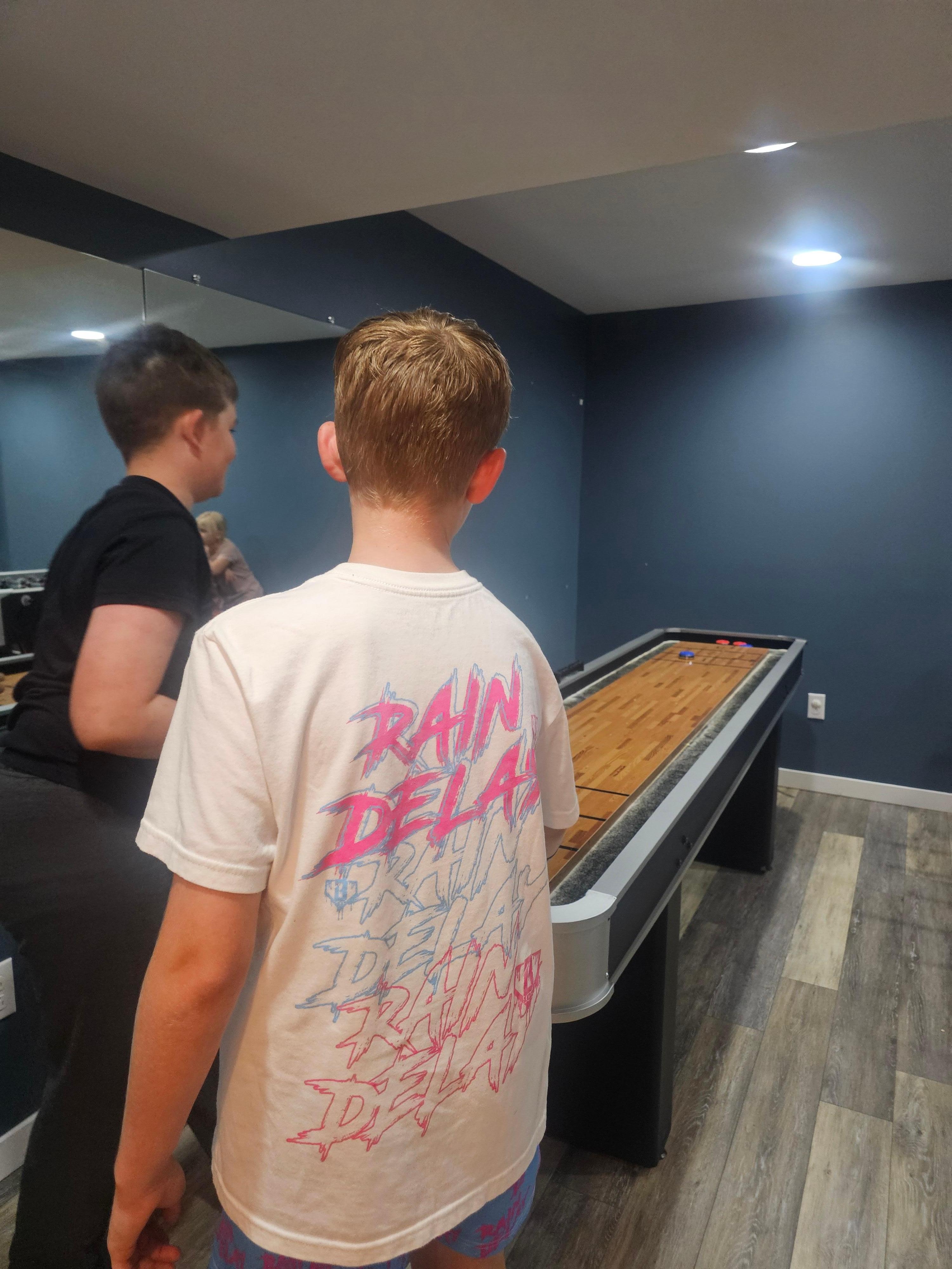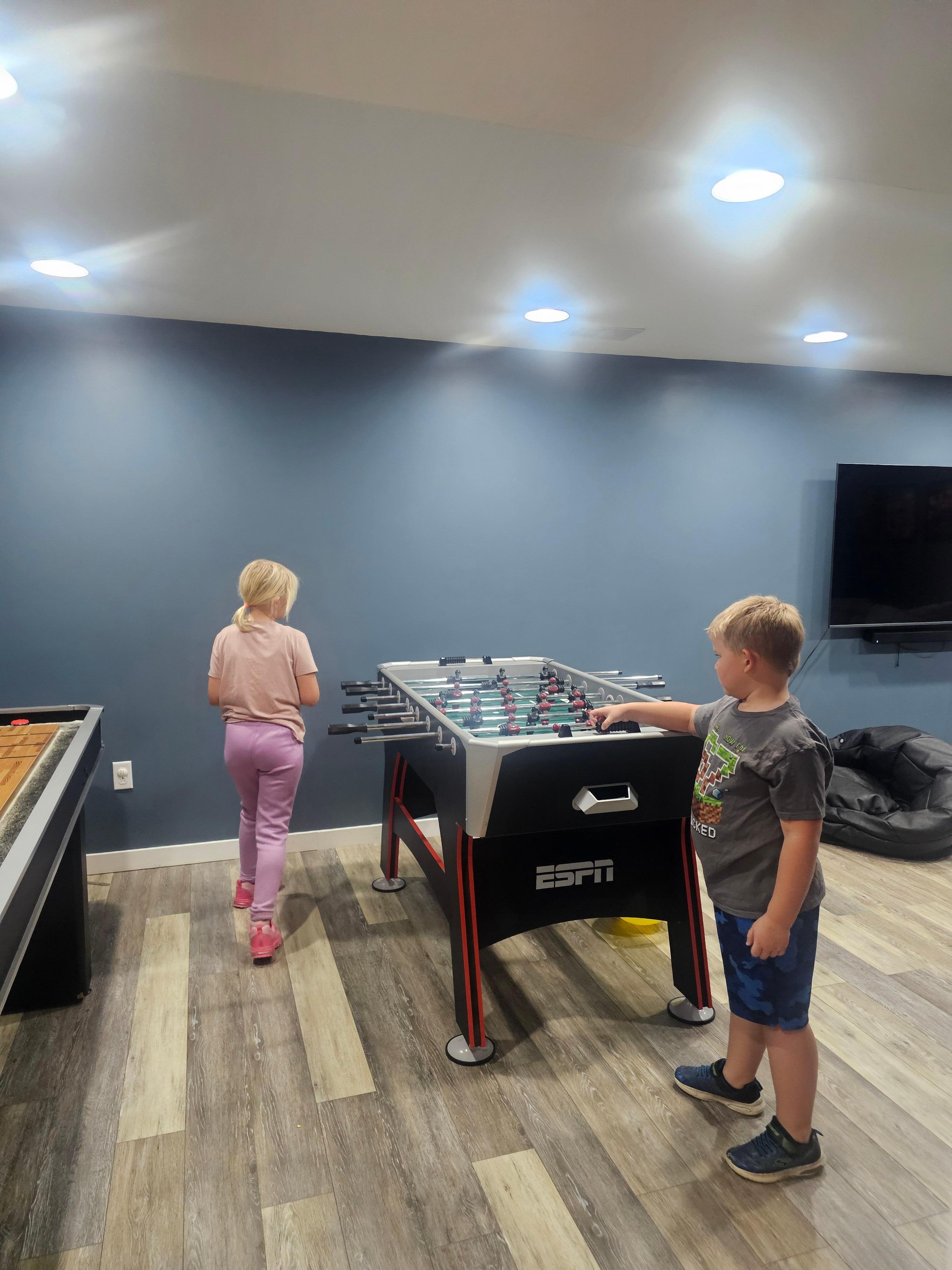 Entertainment room with a super cozy couch, vibrating bean bags, a 64" TV, mini fridge, shuffle board and foosball table.