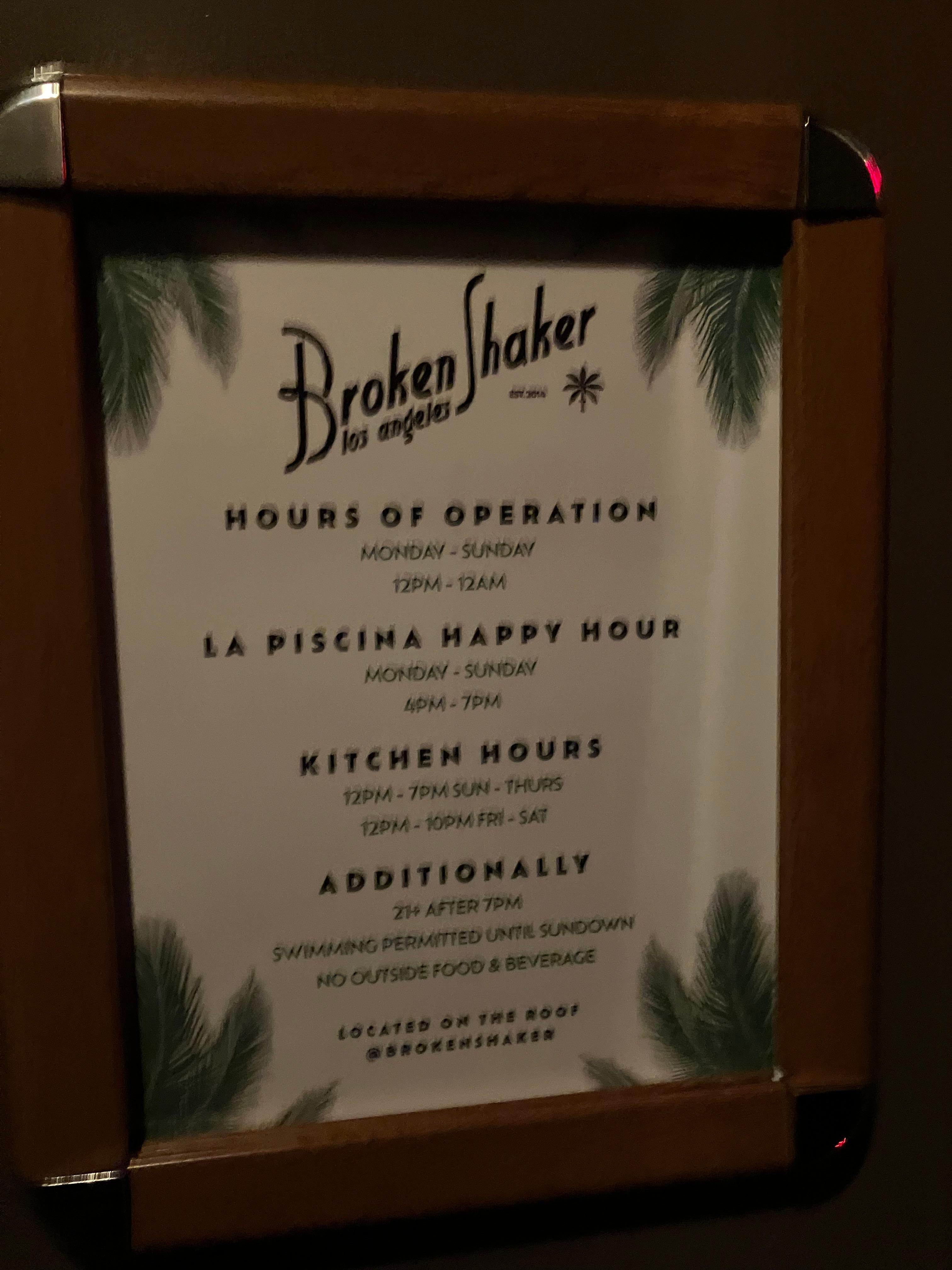 Broken Shaker - This poolside rooftop bar specializes in local cuisine and serves brunch, lunch, dinner, and light fare. Guests can enjoy alfresco dining (weather permitting). Happy hour is offered. Open daily.