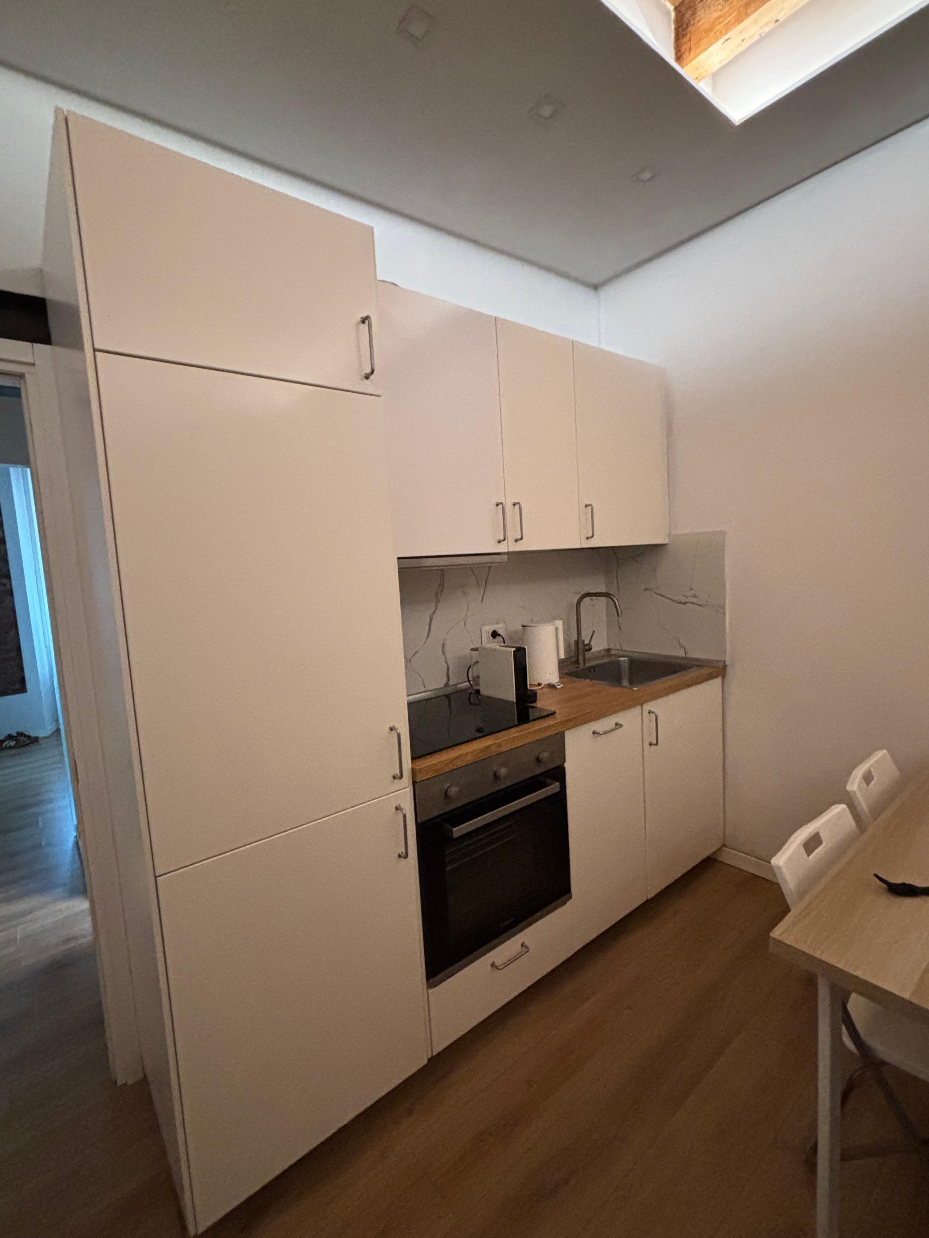Make yourself comfortable in this apartment, featuring a kitchen with a refrigerator and an oven.