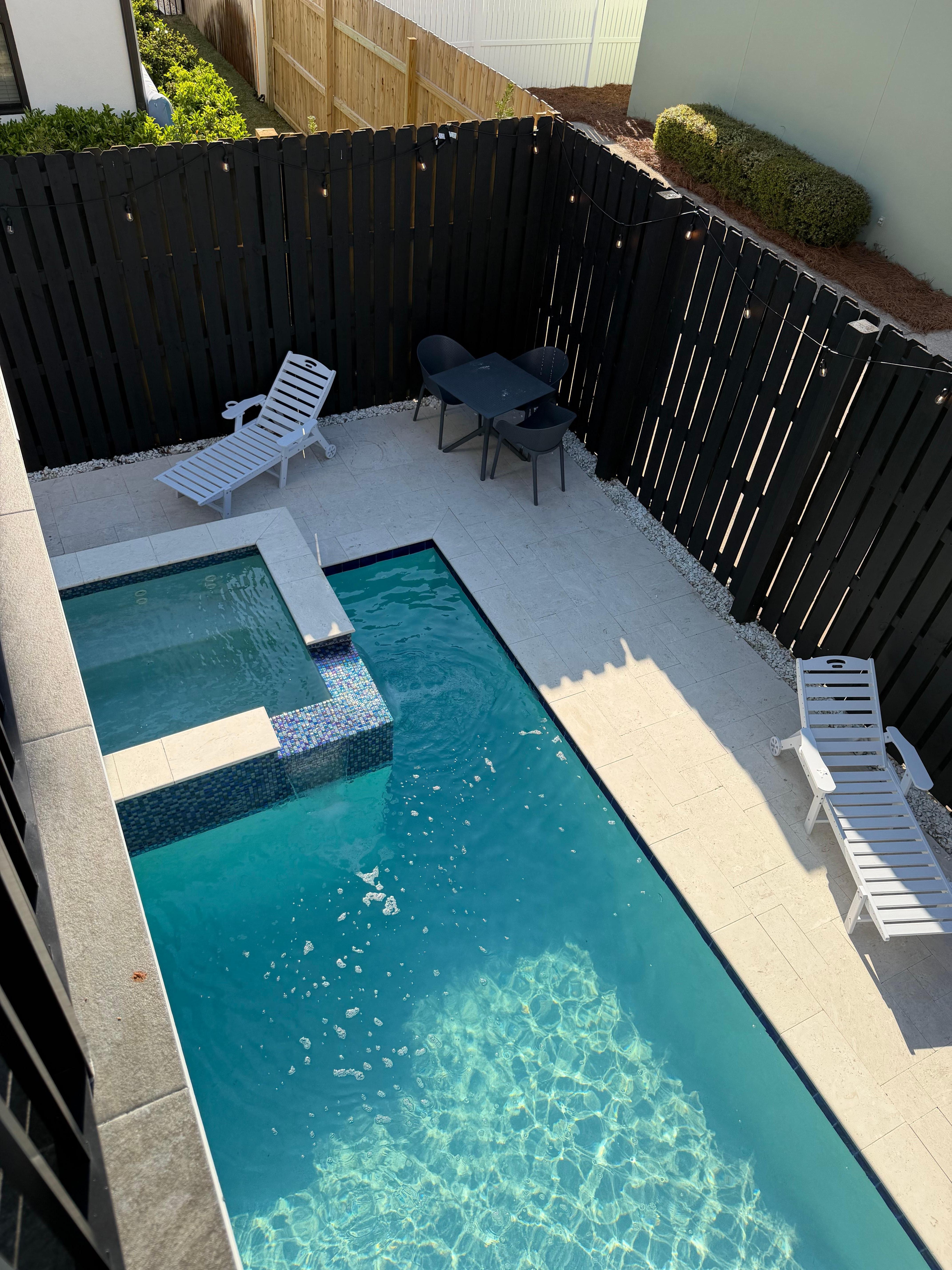 - Access to fenced in backyard with hot tub, heated pool, lounge chairs, dining table, corn hole, and gas grill