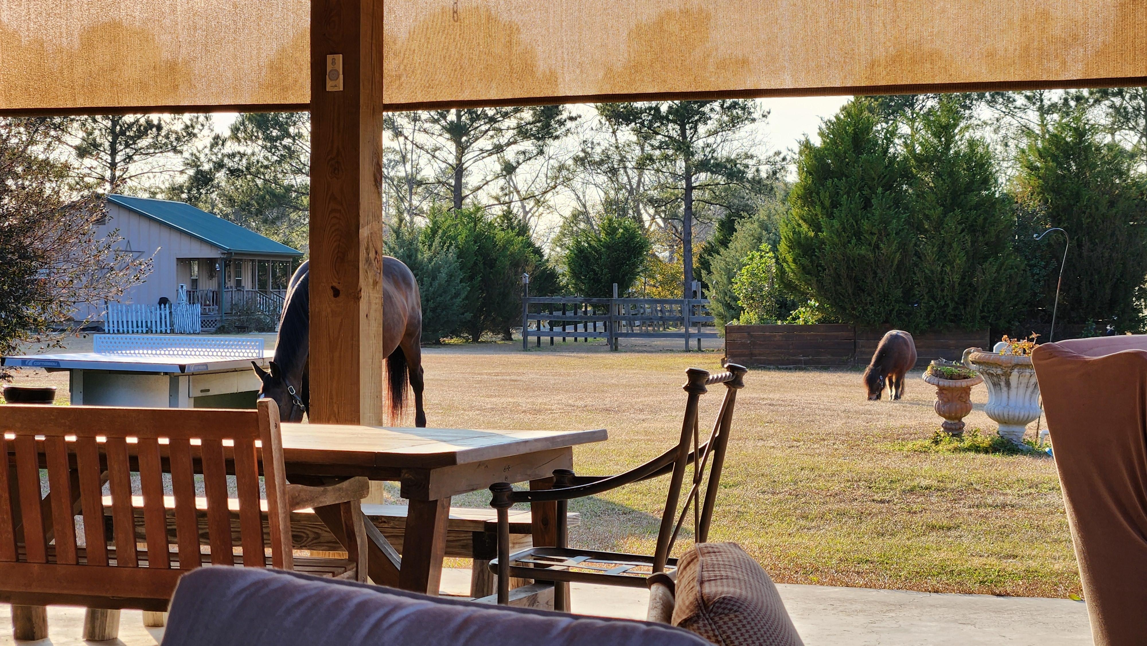 Enjoy relaxation and entertainment in the Silver Bullet’s private, covered outdoor living space. Sit in large, comfy chairs and wrap up in supplied blankets, as you watch your favorite movies, shows, and sports on the 55” smart TV with Firestick, accessing popular streaming services with your own log-ins or choosing a DVD from the huge collection. Challenge your travel partner to a game of ping-pong on the outdoor table. Stretch out in the hammock and sun loungers. Meet horses and other farm animals and gather herbs from the herb garden.