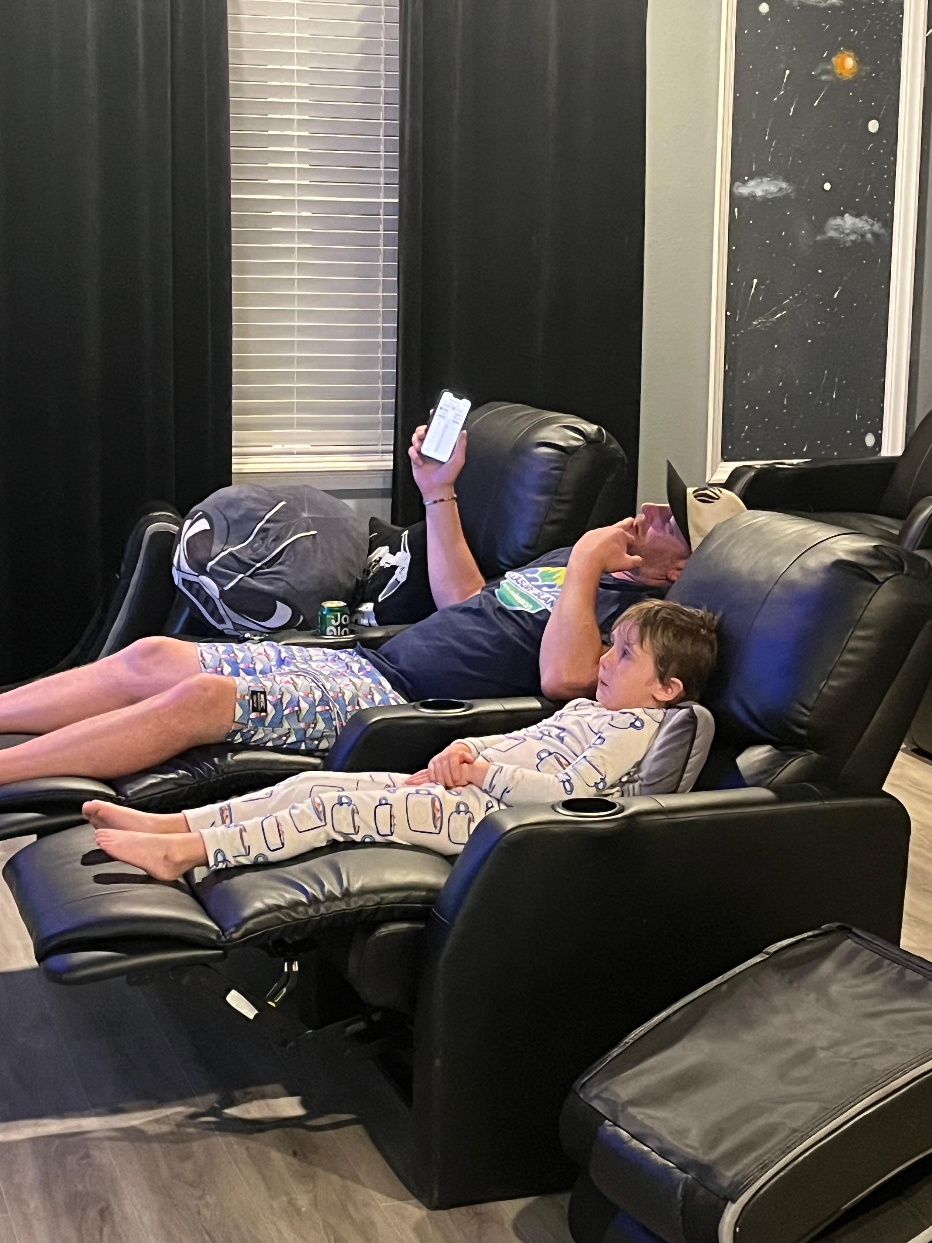 Upper floor loft area has a kid's area and a galactic themed theater area with 3x large flat screen TVs with an X-Box video game console, board games, 2x video gaming chairs, 7x leather recliners, 4 seat table