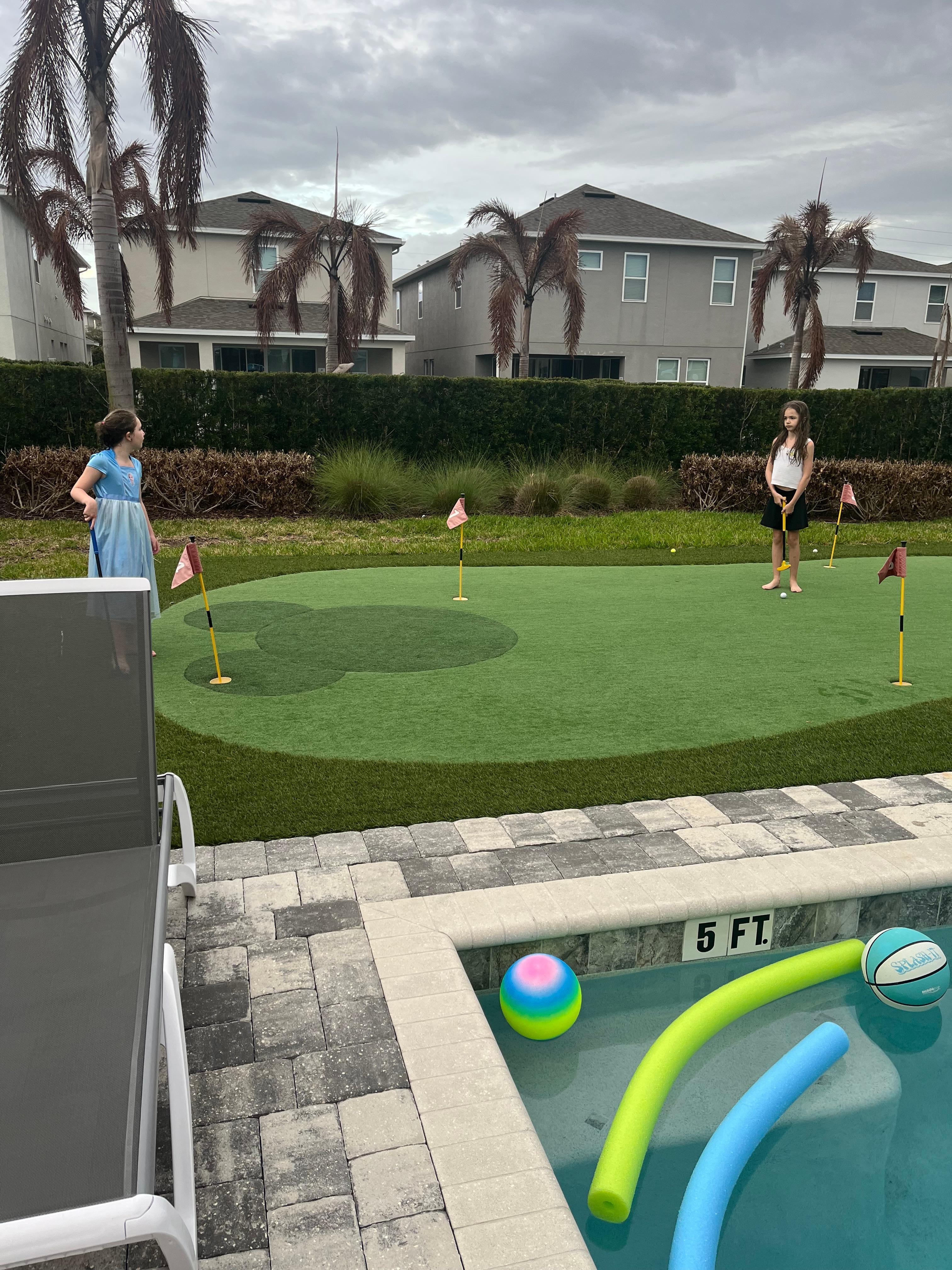 Themed putting green, pool basketball hoop, corn hole
