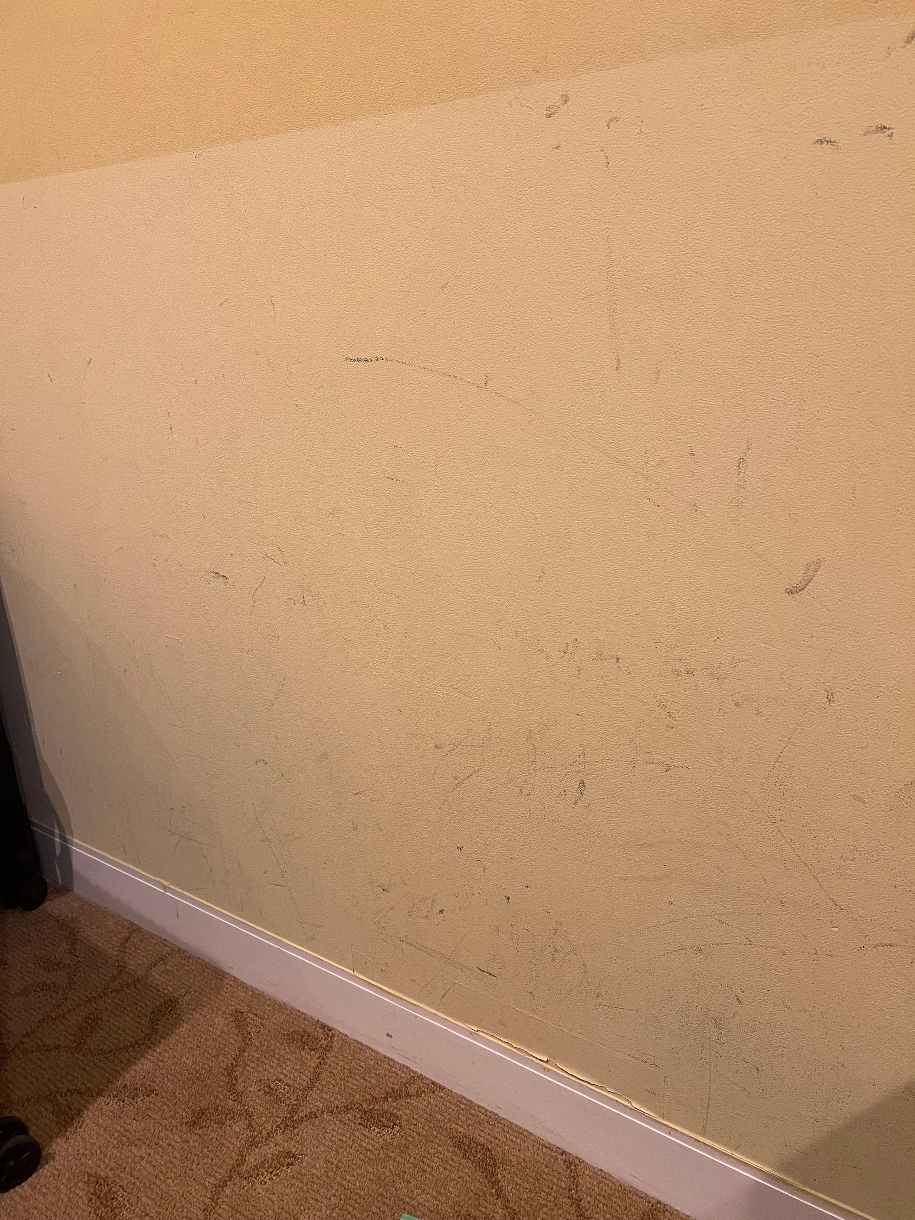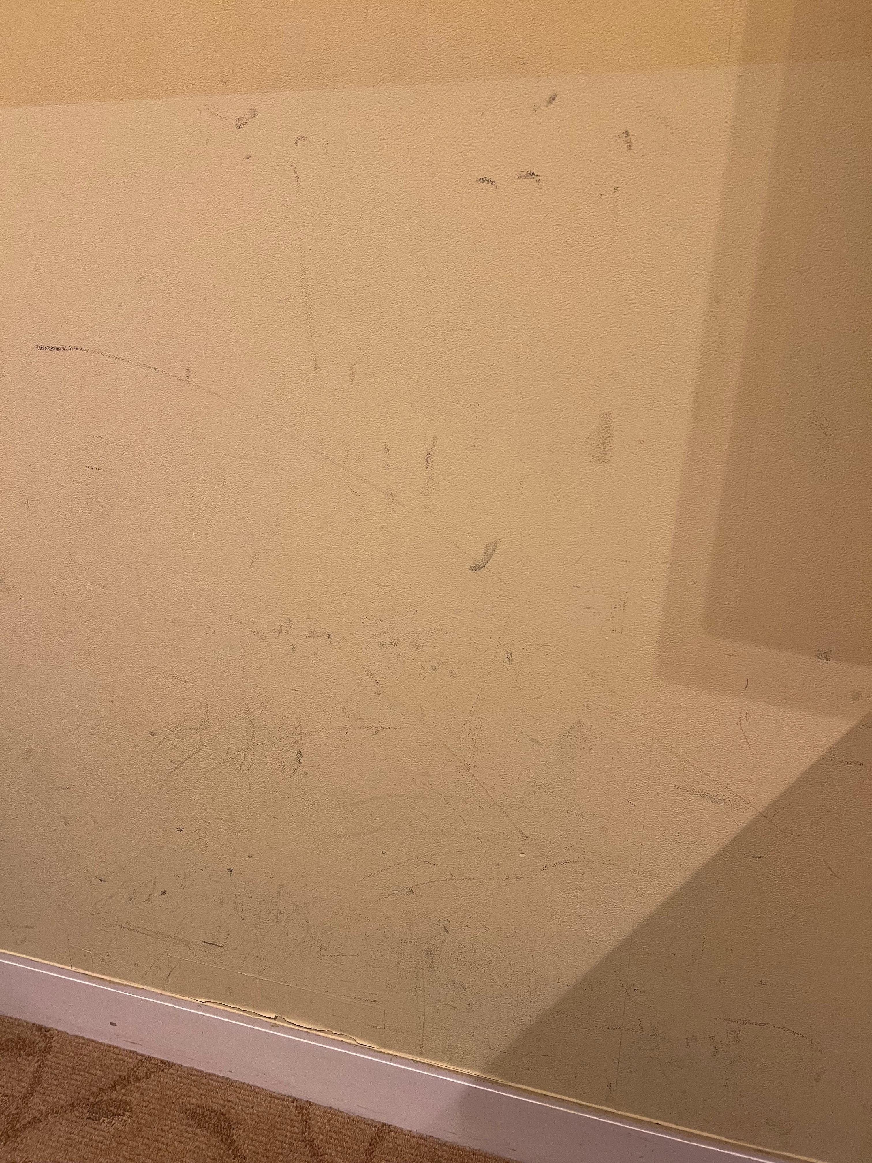 The room has dirty walls, dirty curtains, and worn, unclean carpets. The bed is very uncomfortable, and the pillows are extremely hard. It’s clear that no maintenance has been done for a long time. The room needs painting and overall upkeep.