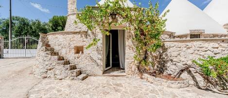 Outside, Trullo Saraceno offers a cozy patio with an outdoor dining area, where you can enjoy al fresco meals surrounded by the beauty of the Apulian countryside. The surrounding garden is an oasis of tranquility, with centuries-old olive trees and colorful blooms that create an enchanting environment to relax and enjoy the peace and serenity of nature.