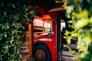 The hotel and grounds itself, it very quirky and clean. The sitting area is very nice and loooks lovely in the evening. The Boujee room was great. From the comfortable bed, to the unique bath. We also had a decking area where we could sit outside which was an added bonus. Onto the slightly more negative comments. Whilst the room was lovely, we had no idea how to work the aircon, lights or bath. It wouldve been nice if someone gave us a quick tour before leaving us to it. We were also told that the Jacuzzi jets in the bath were disconnected and does not work, which was disappointing. It would've been appreciated if a member of staff would walk round the grounds in the evening to make sure everyone was ok. Us along with a couple of other guests were saying how cold it was outside yet none of the fire pits were lit or the gas heaters were moved into an area where people could use them. Lastly, we were told we had to leave an £150 deposit which would be given back at the end. £150 felt abit steep to be honest. To summarise, it is a really quirky place to stay which I assume why its a tad pricey. The rooms, staff and grounds are great, however there is nothing to do at all which is walking distance. Drinks service whilst sitting outshde is non existent. Lovely place to stay, but would like a little bit more outside outside of the actual room.