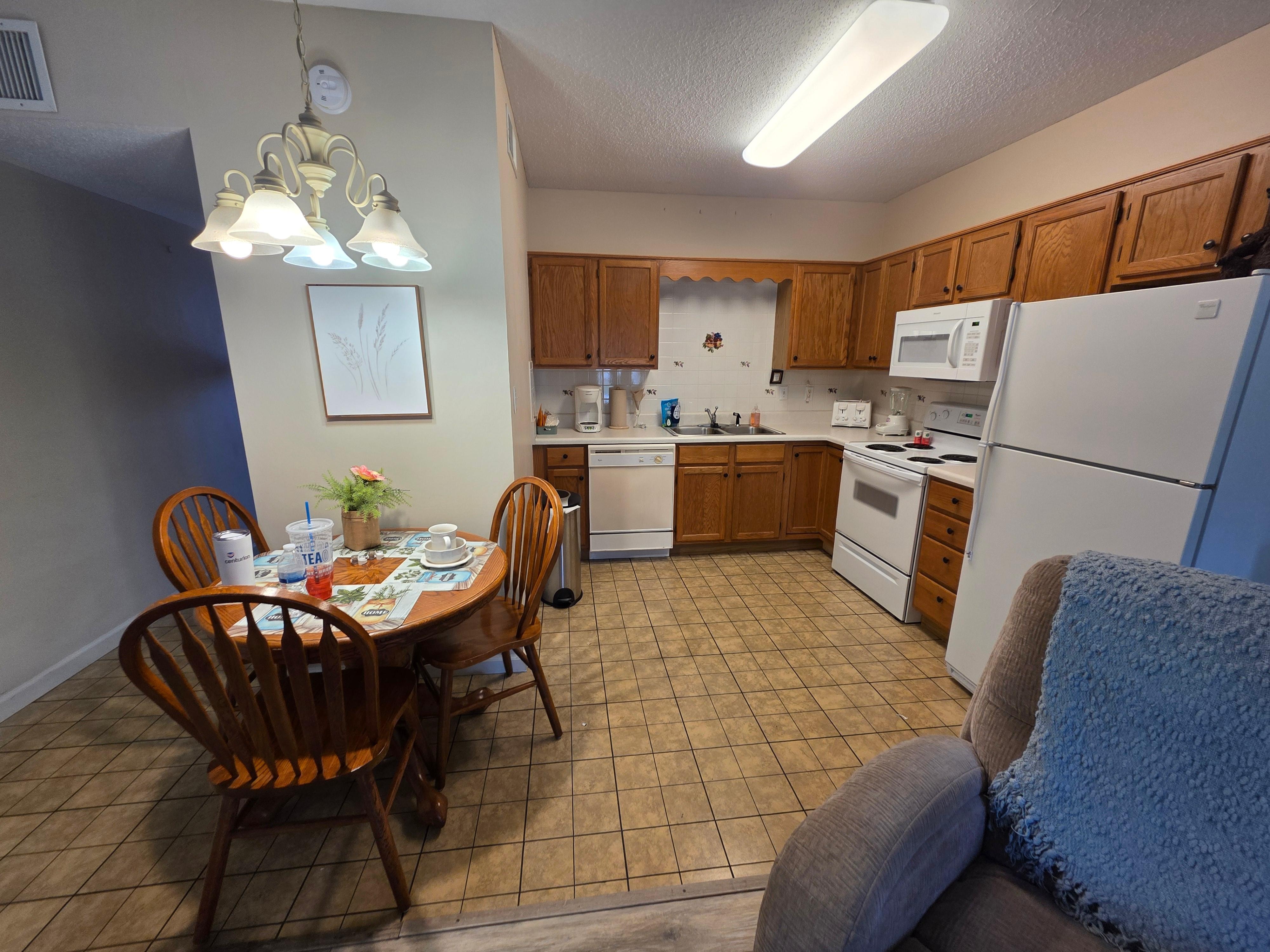 • Full-size refrigerator, range, dishwasher, and microwave