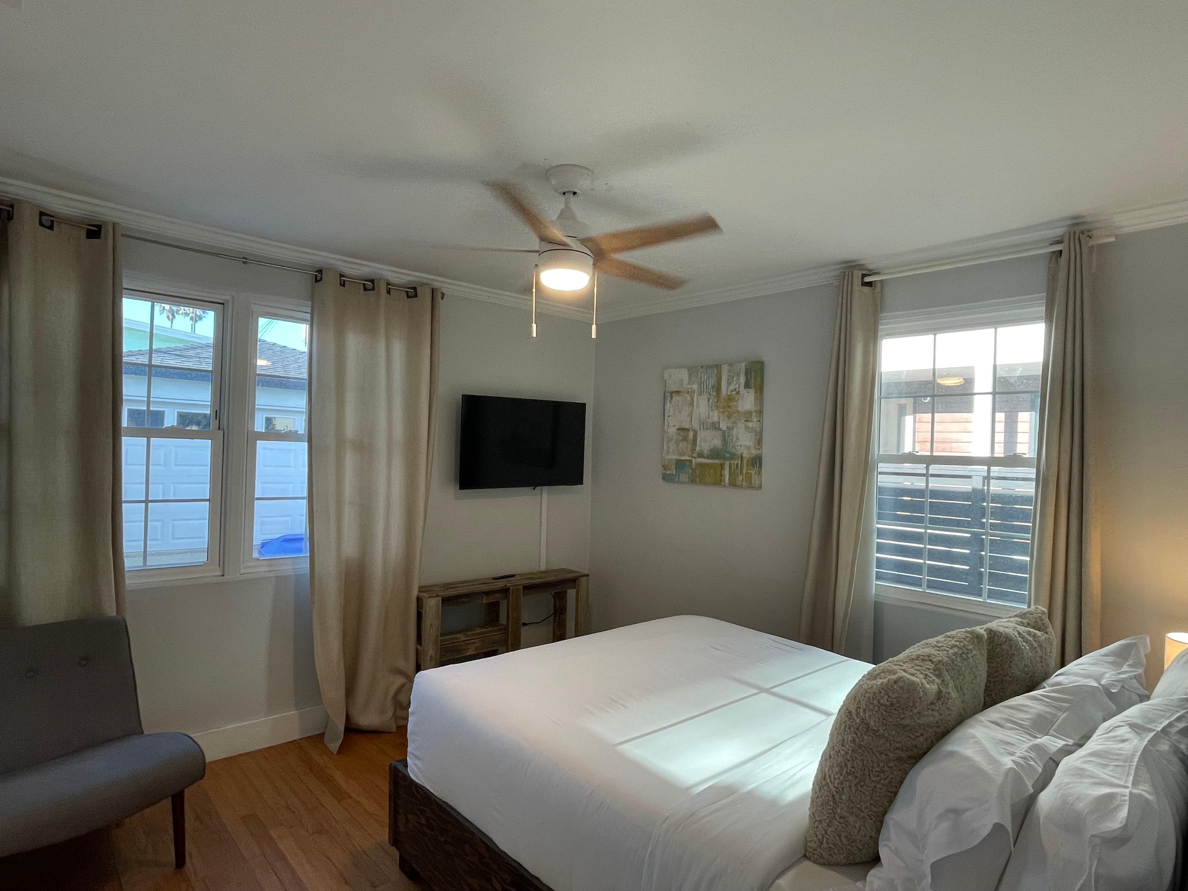With an open layout connecting the living, dining, and kitchen areas, the space is filled with plenty of natural light, making it warm and inviting. The living room is designed for relaxation, featuring comfy furniture, a ceiling fan, and a flatscreen TV. The dining area includes a table with seating for four, perfect for enjoying meals together. In the fully equipped kitchen, you'll find everything you need, along with an island that has barstool seating for two. Both bedrooms are furnished with comfortable queen-sized beds, and the bathroom is crisp and clean. For added comfort, the home includes air conditioning to keep you cool on warmer days, WIFI to stay connected, and washer/dryer (shared). Outside, the shared backyard space is ideal for outdoor relaxation, complete with a BBQ for grilling. With the beach just steps away and the beauty of Pacific Beach all around, this cottage offers a perfect coastal getaway.