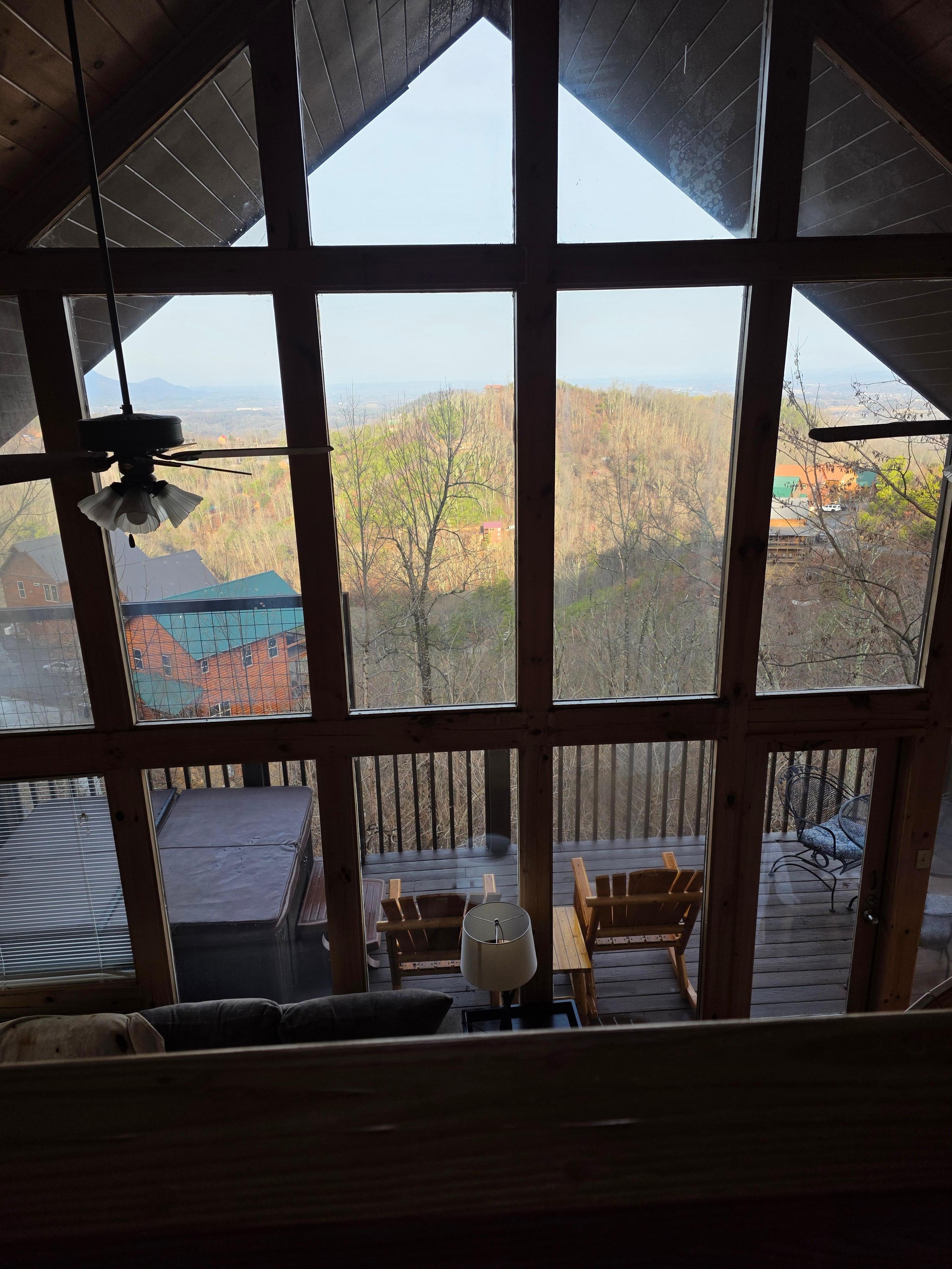 The property looked smaller than the pictures but was fine for us. It was a good location to drive to Gatlinburg, Great Smokey national park and of course Pigeon Forge which we didn’t spend much time in. The beds were comfortable and they supplied plenty of linens. The kitchen stock was pretty meager. The beautiful picture windows were pretty dirty and even had some huge cobwebs on a couple windows. Otherwise the place was clean. The last night we had a huge thunderstorm with wind blowing rain against the cabin. Water started leaking in under the baseboards and in some of the windows. We lost power for 5 hours which couldn’t be helped but there were no candles or flash lights. Thankfully we had driven and had flashlights in the car. Overall a pleasant stay.
