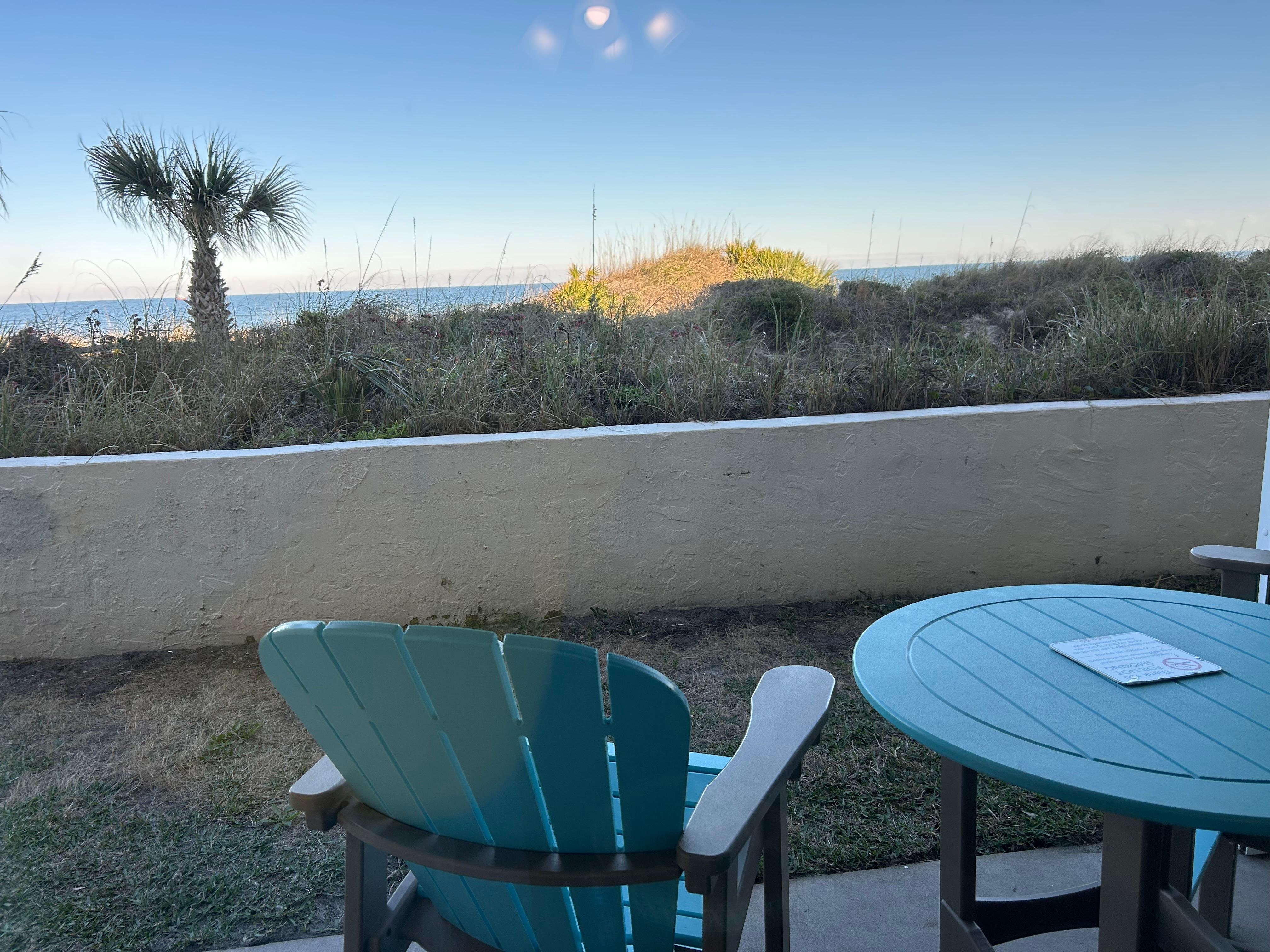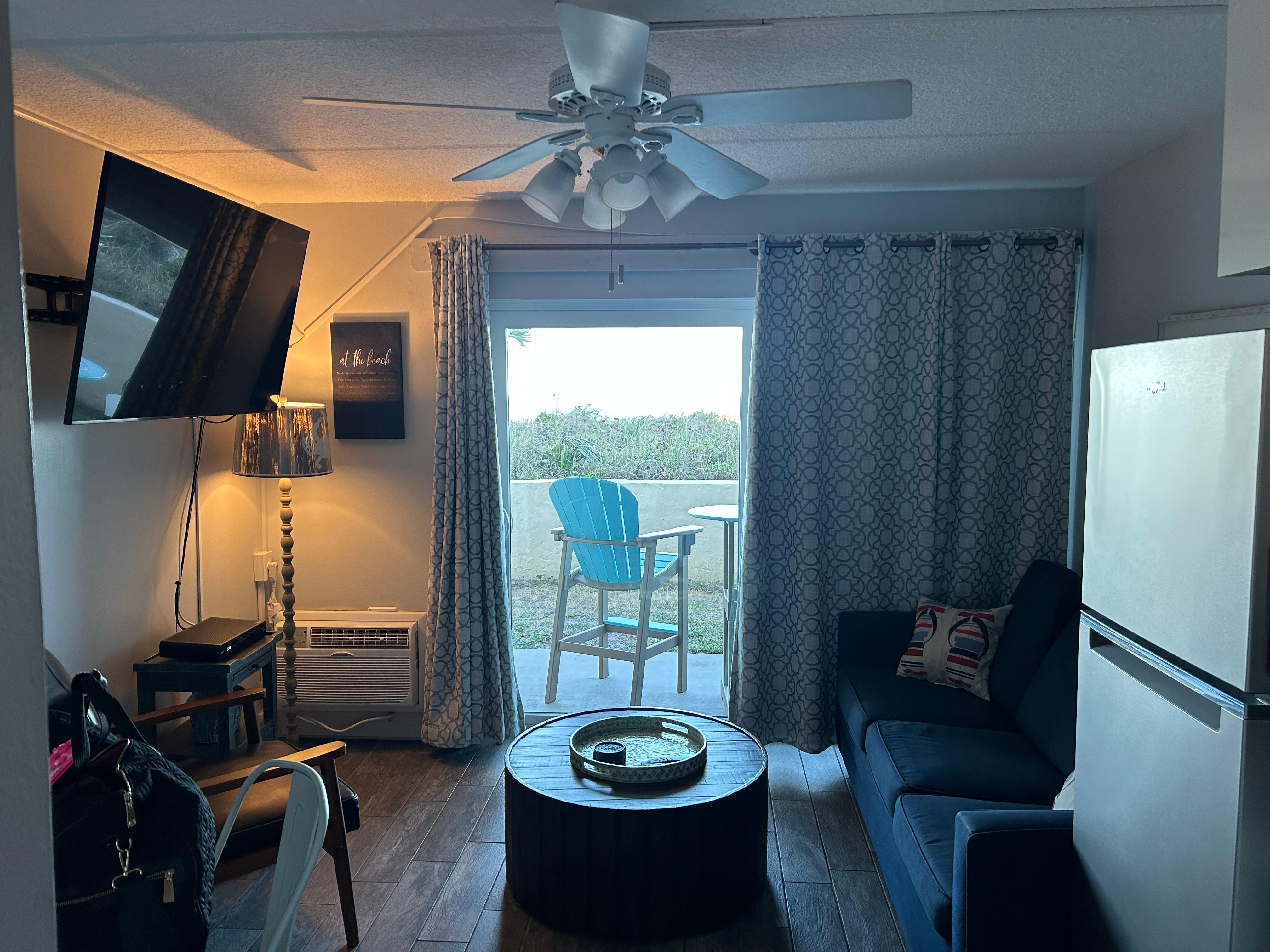 The cozy oceanfront patio suite will delight you into staying as long as you can by the seaside. Nestled in the sand dunes, this ocean view patio provides a peek at the ocean on one side and enchanting sea oats swaying in the sand dunes on the other. Enjoy the sea breeze from your oceanfront living room with queen sleeper sofa and large flat screen tv. Basic TV cable channels (as of 3/2025) or smart tv features available. Eat in, as this condo has modern kitchen amenities equipped with 2 burner stove top, microwave, toaster, coffeemaker, refrigerator and kitchen sink. This condo has a bathtub shower combo and corner vanity that gives a bit more room than the typical Beacher's Lodge bathroom. Retreat to the king sized bed in the private bedroom and enjoy the flat screen tv and custom closet shelving. This condo has daily housekeeping service included in the rate for nightly and weekly stays, once a week housekeeping on monthly stays. Pets allowed, 2 pet max, $75 per pet per stay. Grass outside of patio is not a dog walk area. Daily housekeeping service included in nightly rate for nightly or weekly stays, once a week housekeeping in monthly stays. Minimum age to rent is 21 years old