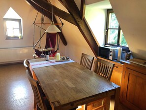 The gallery apartment is comfortably furnished, fully equipped and integrated into the history of one of the oldest wineries on the Moselle. There are three apartments in the Burghof Hagen (each with about 55 sqm, private shower room, fully equipped kitchen and use of the sauna) and a double room. All in all, up to 8 people can spend their holidays with us, explore the Moselle landscape and take a break from everyday life. The apartment itself is for 2 persons. The living space in total can be divided according to personal needs in 50sqm, 60sqm or 110sqm. All apartments have a patio in their own vineyard directly at the house. You are welcome to taste our own wine (Riesling and Pinot Noir) or discover and enjoy it on a wine hike at the place of origin.